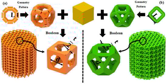 Modeling diagram of two types of porous prostheses. (a) Octagonal structure; (b) Rhombic structure. (Reproduced from [82] with permission).