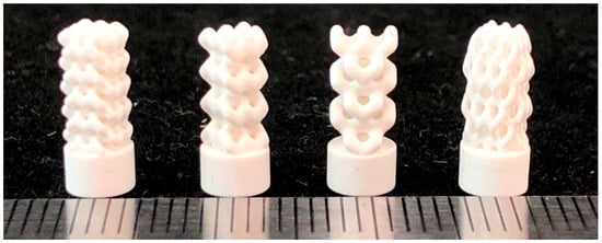 Ceramic materials generally have the dilemma of difficult cutting and forming, and are difficult to be prepared by traditional processes. By controlling specific wavelengths of ultraviolet light with computers, SLA technology can selectively cure flowing ceramic slurry, ultimately transforming it into a precision-structured high-performance ceramic, as shown in Figure 17 [125]. Therefore, SLA is one type of laser rapid prototyping technology, featuring excellent feature resolution and surface smoothness. Ceramic slurry mainly contains ceramic powder, photosensitive resin, and various additives (dispersants, photoinitiators, etc.). Stable materials and meticulous post-processing are key factors in manufacturing high-precision, complex-shaped ceramic implants. Safonov et al. [126] prepared alumia bone implants with customized porous structures using SLA technology, and four types of structures are shown in Figure 18. Wang et al. [127] developed a novel aqueous HA suspension for SLA technology, possessing good rheological properties and curing performance. By optimizing parameters such as surfactant concentration, solid loading, and particle size, ceramic components meeting the strength requirements of trabecular bone were successfully fabricated. Besides ceramics, SLA technology is also widely used for printing polymers and their composite materials. Bergmann et al. [128] fabricated customized bone implants composed of β-TCP and BAG, with good biodegradability and biocompatibility, for repairing defects in the maxillofacial and cranial bones. Kebede et al. [129] prepared HAp-dimethylacrylamide material with excellent mechanical properties via SLA, achieving a tensile strength of 30.2 MPa, which can be applied in the field of bone regeneration.