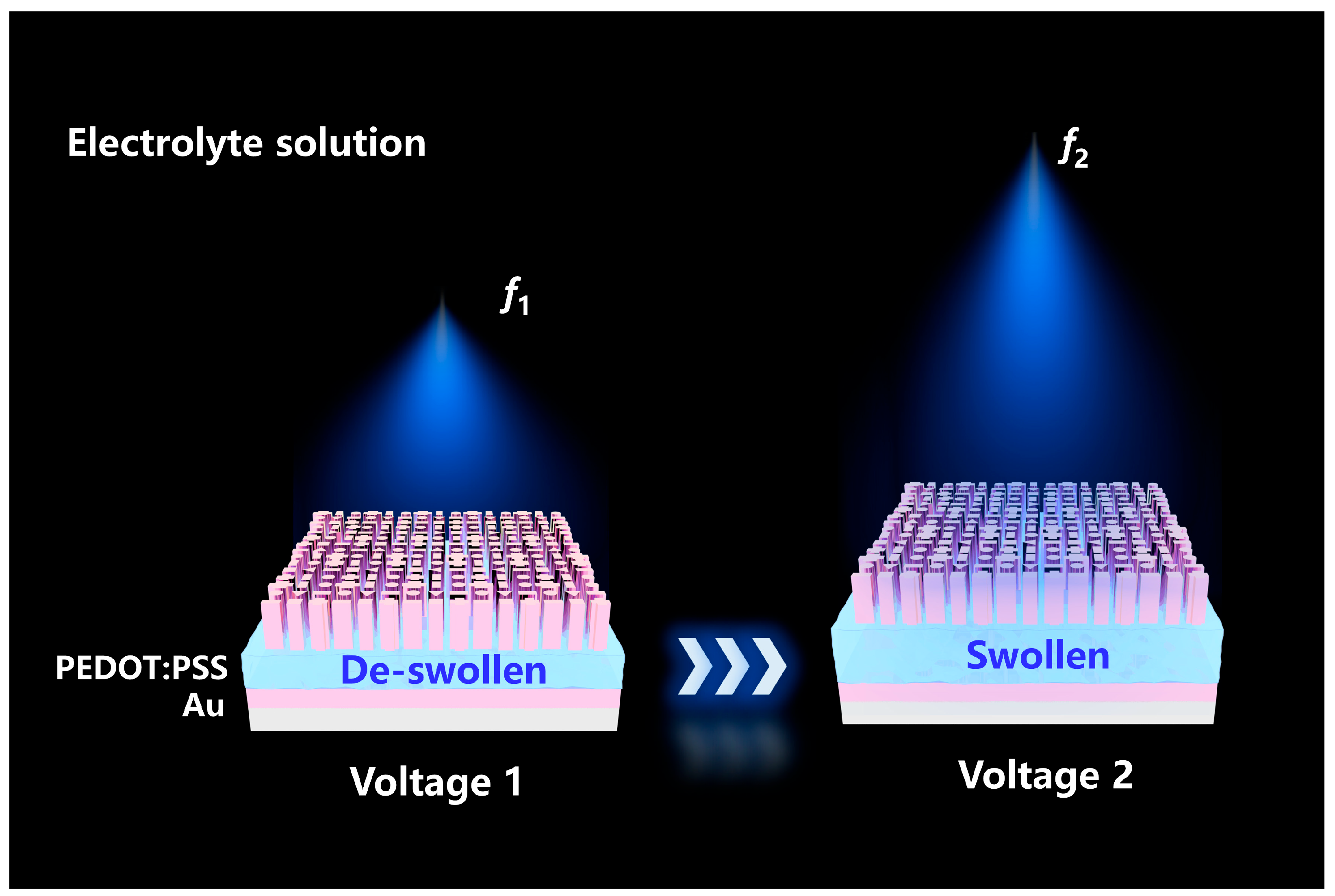 - Doshi, S.; Ji, A.; Mahdi, A.I.; Keene, S.T.; Selvin, S.P.; Lalanne, P.; Appel, E.A.; Melosh, N.A.; Brongersma, M.L. Electrochemically Mutable Soft Metasurfaces. Nat. Mater. 2025, 24, 205–211. [Google Scholar] [CrossRef]