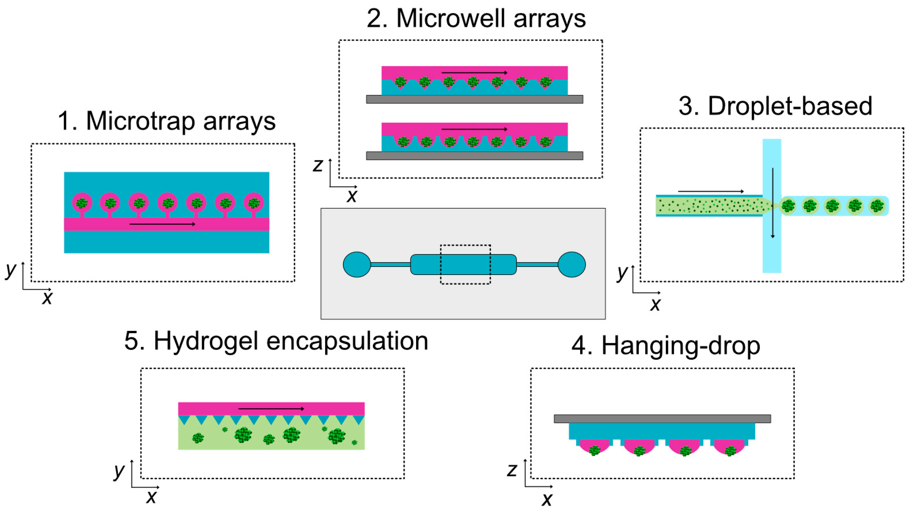 | Agarose Microwell arrays | Microfabricated agarose wells in a chip capture and aggregate cells into spheroids. Allows parallel formation, size control, and easy imaging | Simple, parallel, easy imaging | Limited to certain cell types; less dynamic environment | [22] |