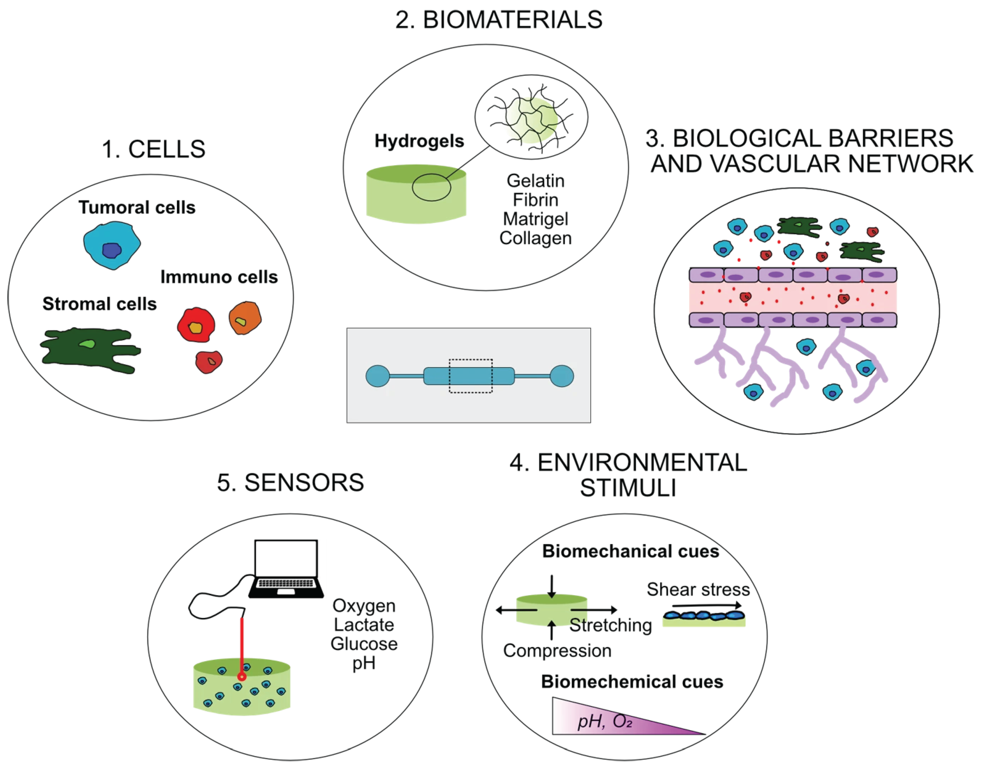 - Biological Barriers: Devices can replicate key physiological barriers, such as endothelial, epithelial, or blood–brain barriers, allowing investigation of invasion, metastasis, and drug permeability—for instance, in glioblastoma (BBB models) or metastasis research (endothelial permeability) [50].