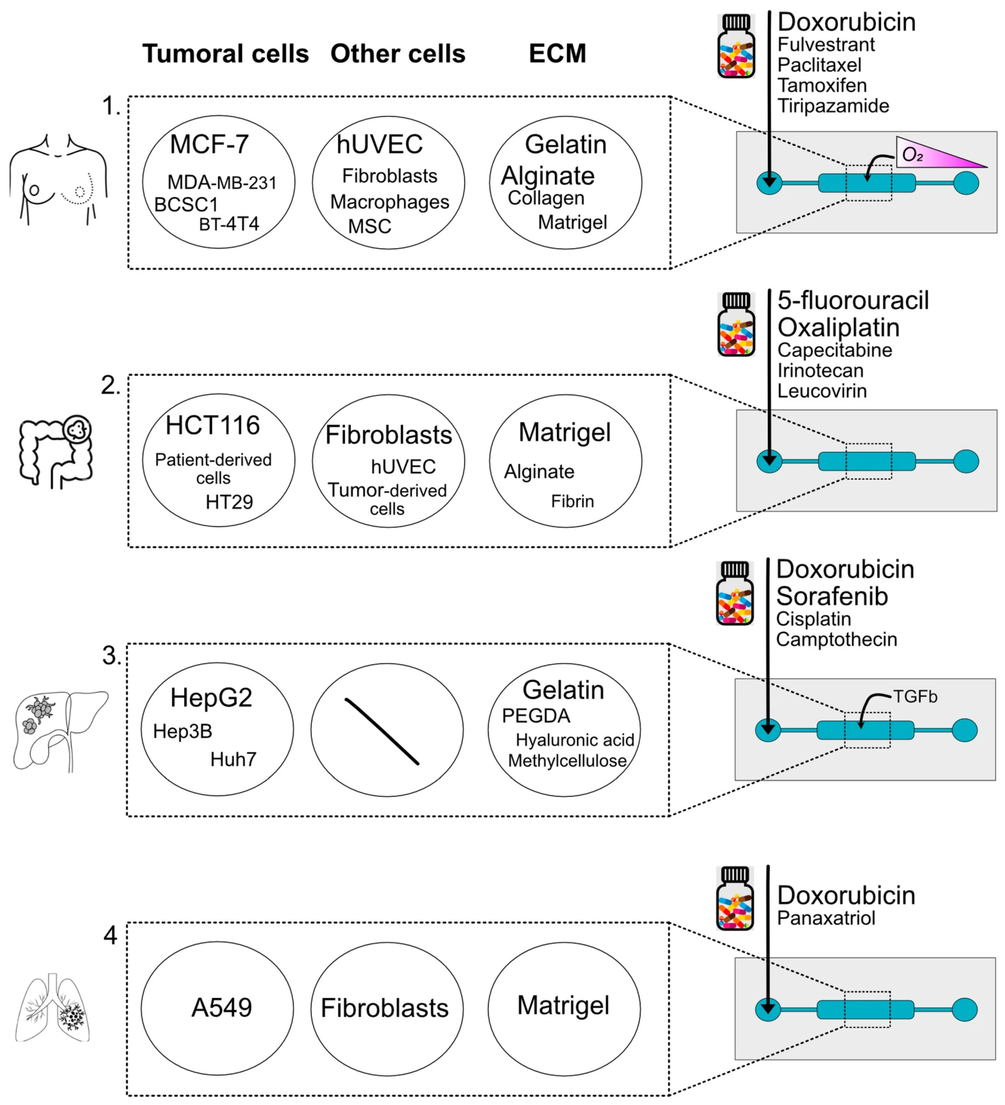 - Sensors: Integrated sensors enable monitoring of chemical and mechanical parameters within the TME—such as oxygen, pH, and shear stress—and real-time detection of cell-derived factors like cytokines, and signaling molecules [51]. Sensor-equipped tumor-on-a-chip systems have also been used for continuous measurement of metabolites, like glucose, lactate, and oxygen levels, providing quantitative insights into metabolism and drug response to agents such as doxorubicin, paclitaxel, fulvestrant, 4-hydroxy-tamoxifen (4-OHT), and tamoxifen [39,52].