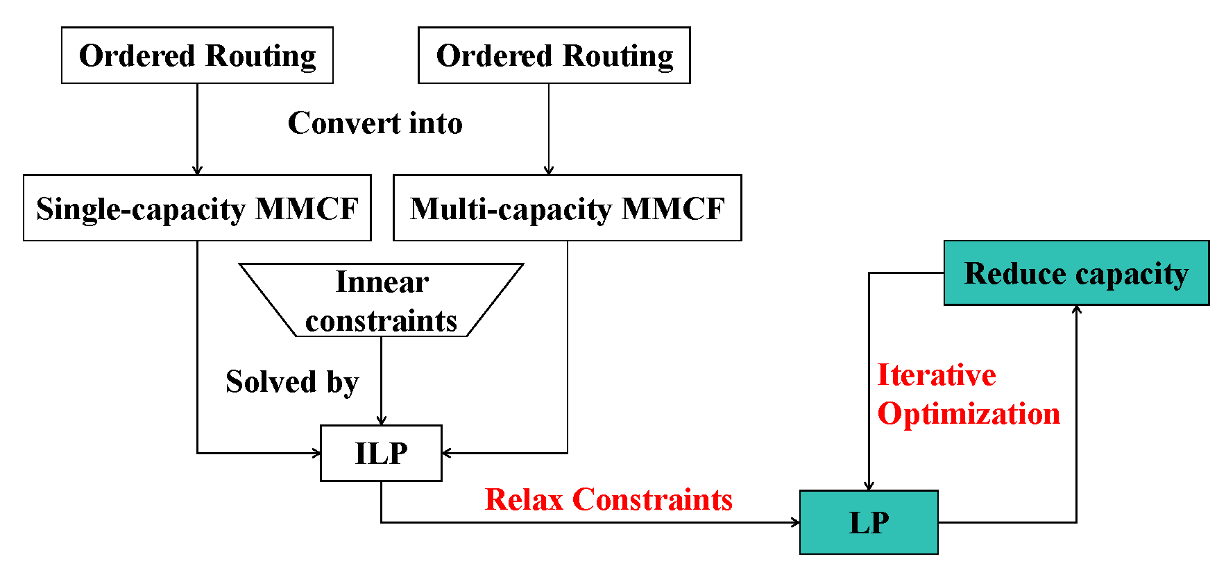 - We use the MMCF model and LP method to solve the fan-out WLCSP I/O ordered routing problem. The LP method has polynomial time complexity, which is faster than the traditional ILP solver, for dealing with ordered routing problems. Then, we use the DFS to process the LP flow results to obtain candidate paths.