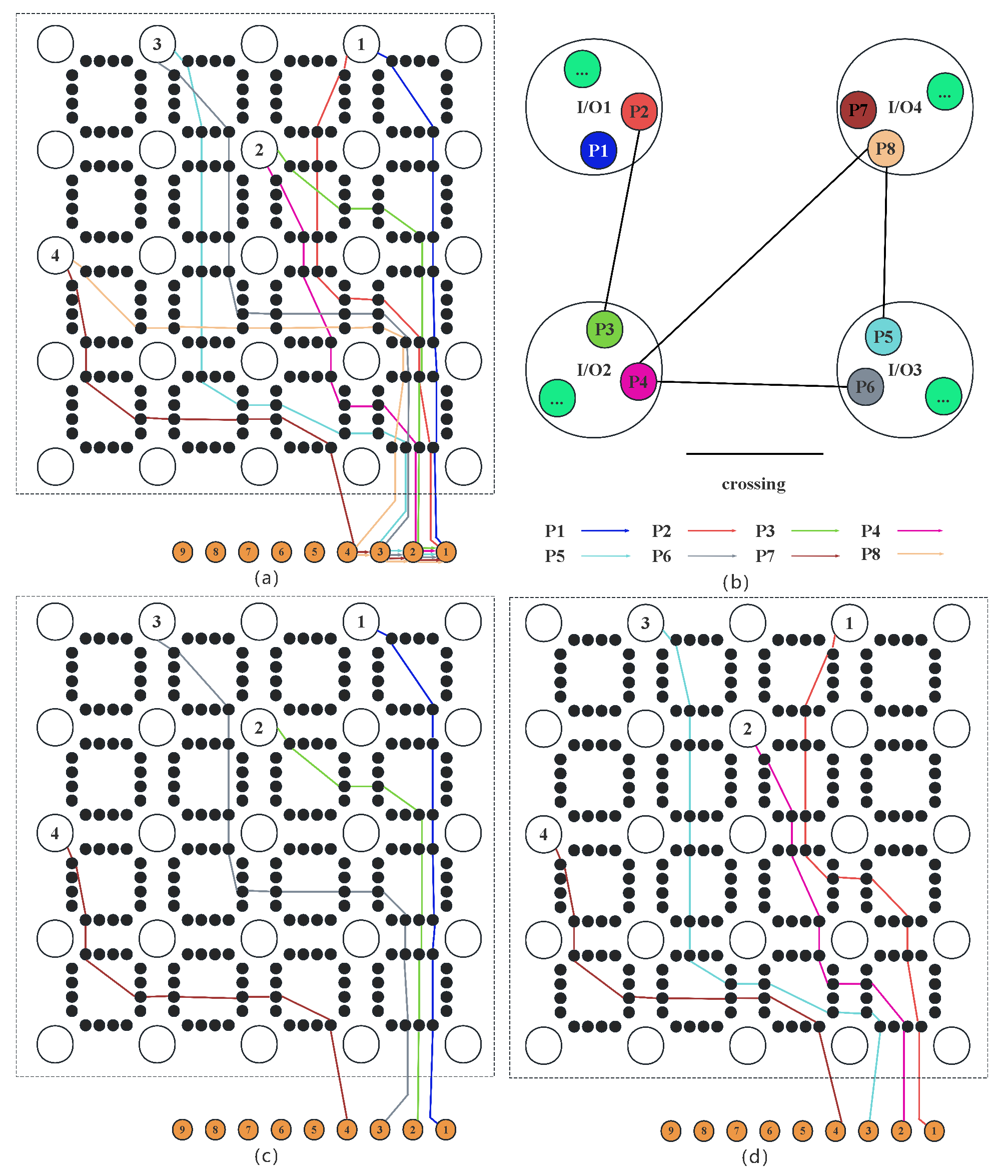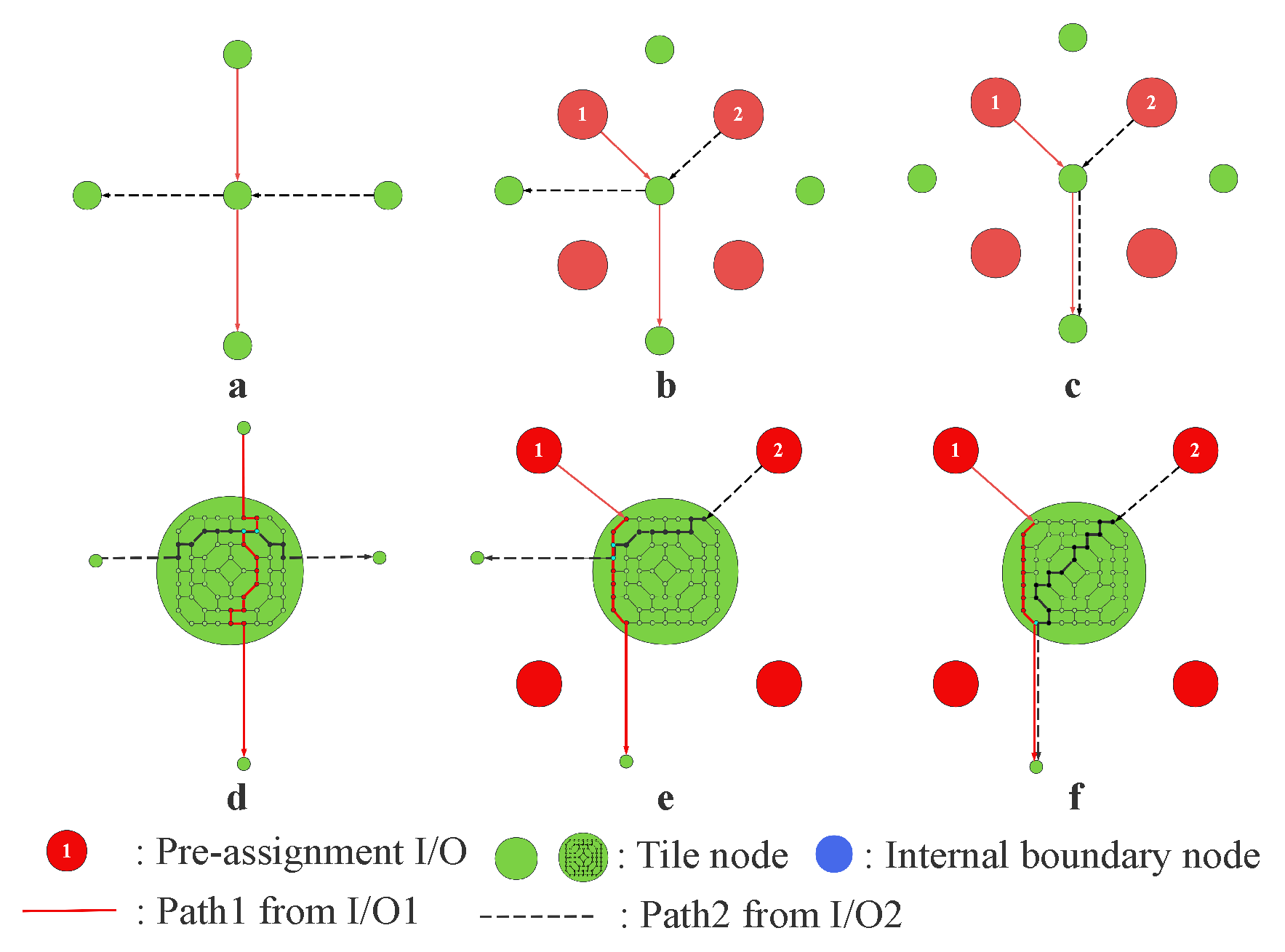 - We propose a crossing weight heuristic algorithm to solve the problem of path crossings. It can quickly obtain legal routing results that conform to the ordered routing constraints. We set the capacity of tile nodes and edges that have completed the routing path to 0. It solves the problem where the follow-up path crosses the completed routing path in iterative routing.