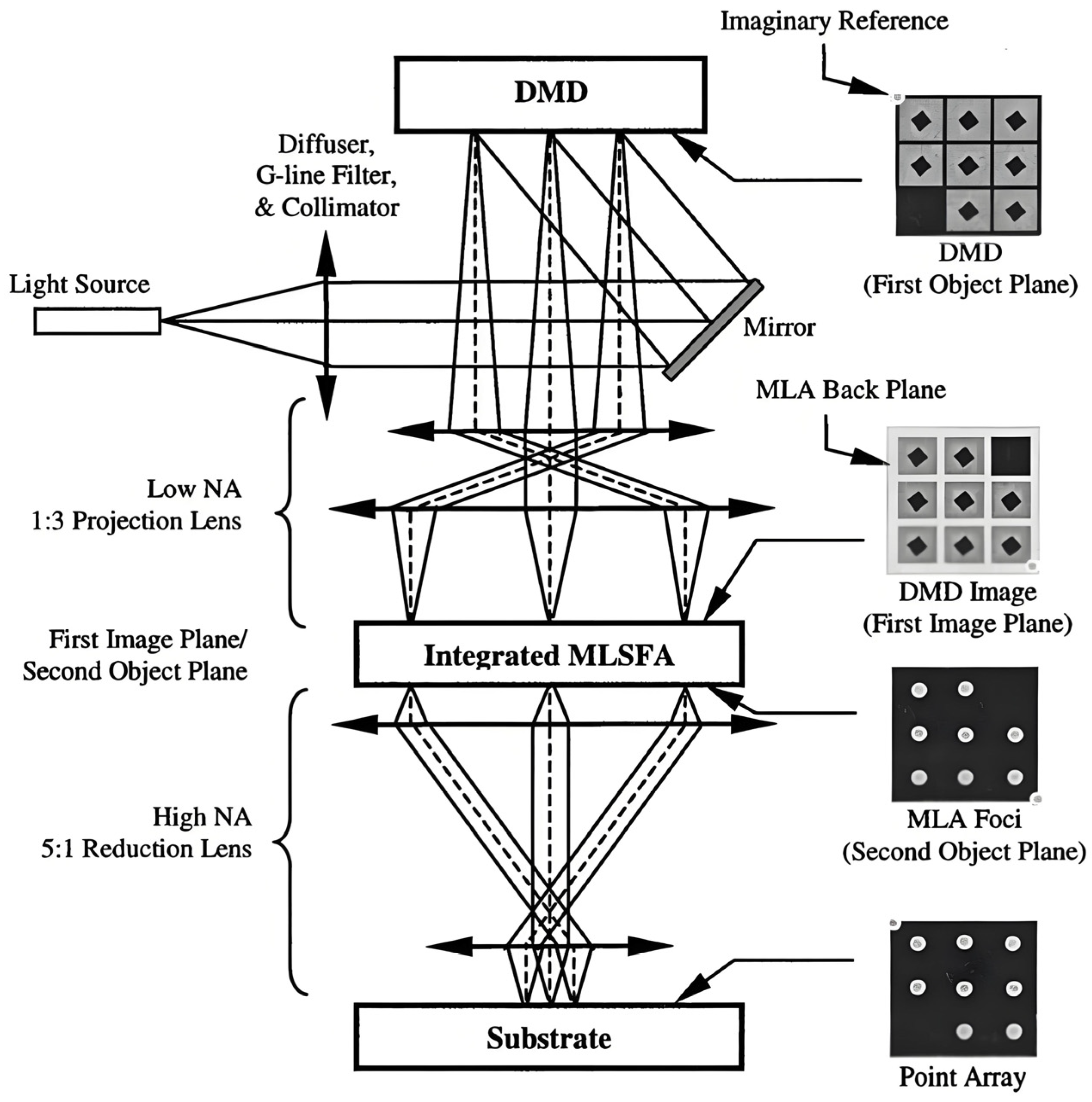 - Chan, K.F.; Feng, Z.; Yang, R.; Mei, W. High-resolution maskless lithography by the integration of micro-optics and point array technique. In Proceedings of the MOEMS Display and Imaging Systems; SPIE: Bellingham, WA, USA, 2003; pp. 37–43. [Google Scholar]