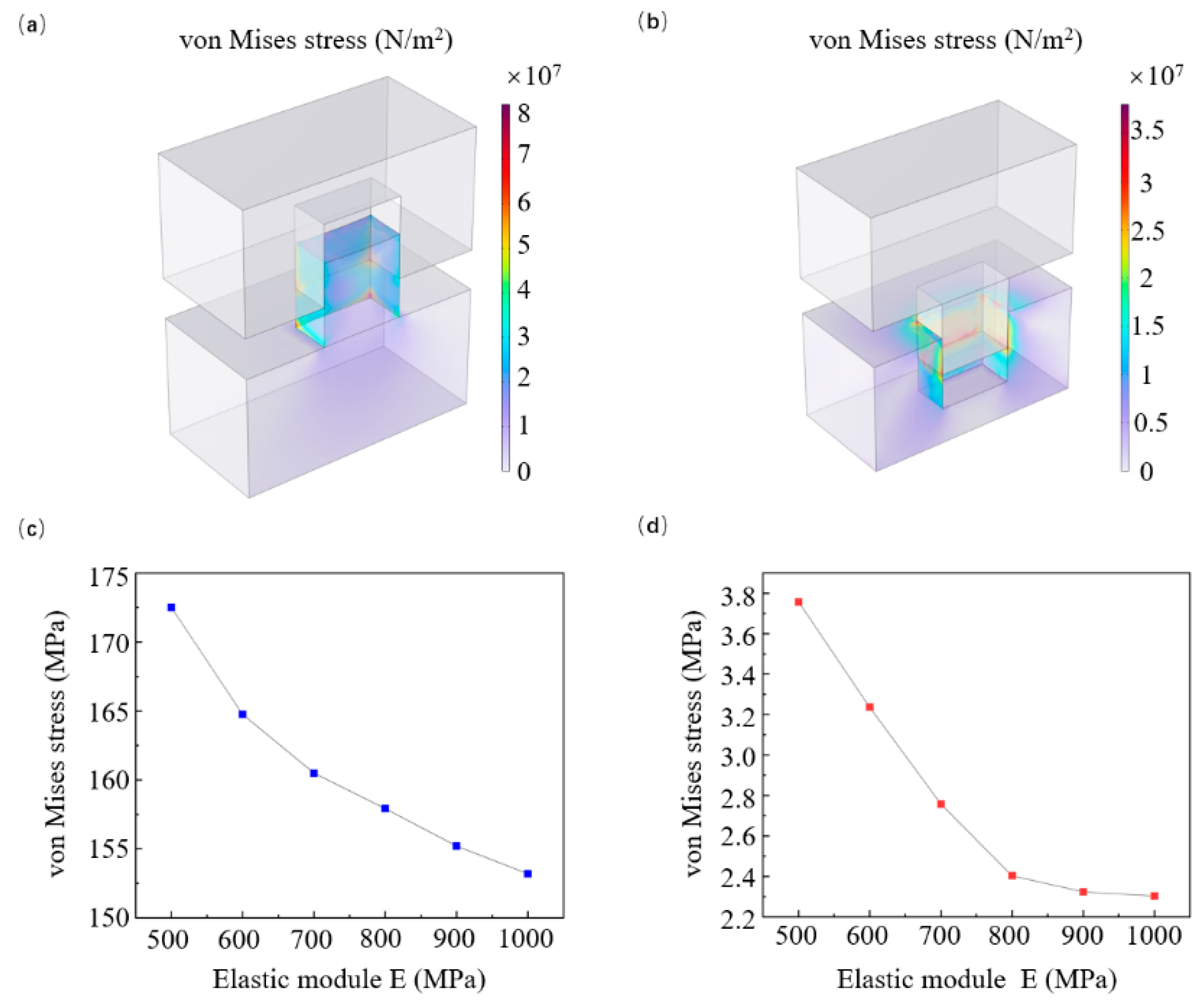 ω denotes the angular velocity of the roller rotating around its center at any given moment. Within each interval, the mold undergoes a small incremental movement, and the von Mises stress distribution for that segment is computed. Through the parametric scanning of all time points, a complete demolding process can be reconstructed. The mold’s motion follows the equations outlined below, which describe its movement from the initial coordinates (