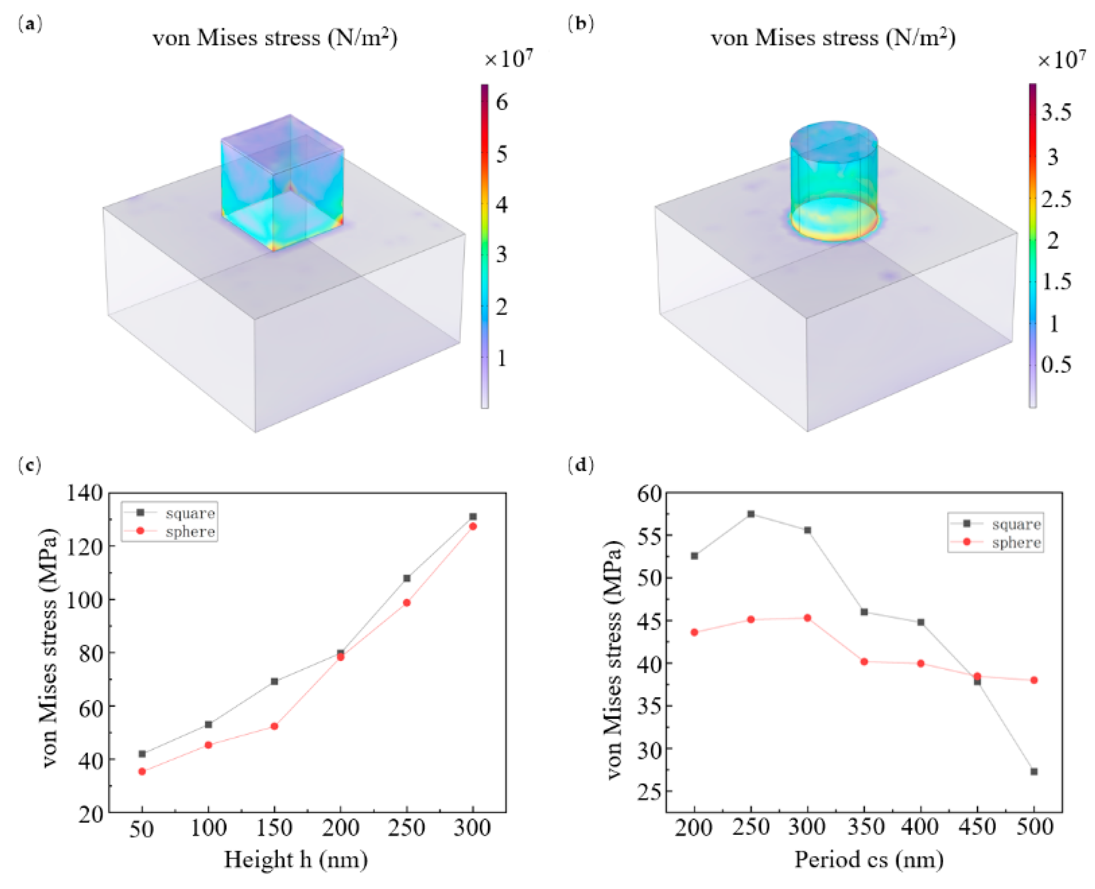 Figure 5d, stress first increases and then decreases with the period rising at a fixed line width. Notably, the stress response of cylindrical pillars to period changes is significantly more muted than that of cuboid pillars, mainly because cylindrical surfaces disperse stress more evenly than the right-angle edges of cuboids.