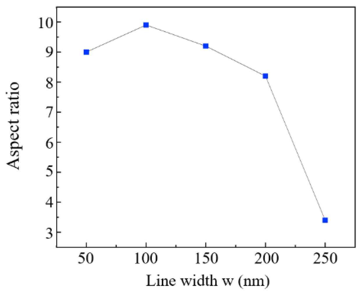 Figure 6, the limiting aspect ratio reaches a peak when the line width is 100 nm. For narrower line widths, severe stress concentration at the structure root means even small lateral forces induced by the rotation of the elastomeric roller during demolding can exceed the resist’s yield strength, leading to structural fracture. However, the sharp reduction in contact area reduces the total demolding force to a greater extent than the stress concentration elevates the fracture risk. Thus, narrower lines generally achieve a higher limiting aspect ratio compared to excessively wide ones such as over 200 nm. For overly wide lines such as 250 nm, the failure mode shifts from root fracture to global buckling instability. The structures bend rather than break, resulting in a sudden drop in the limit aspect ratio.