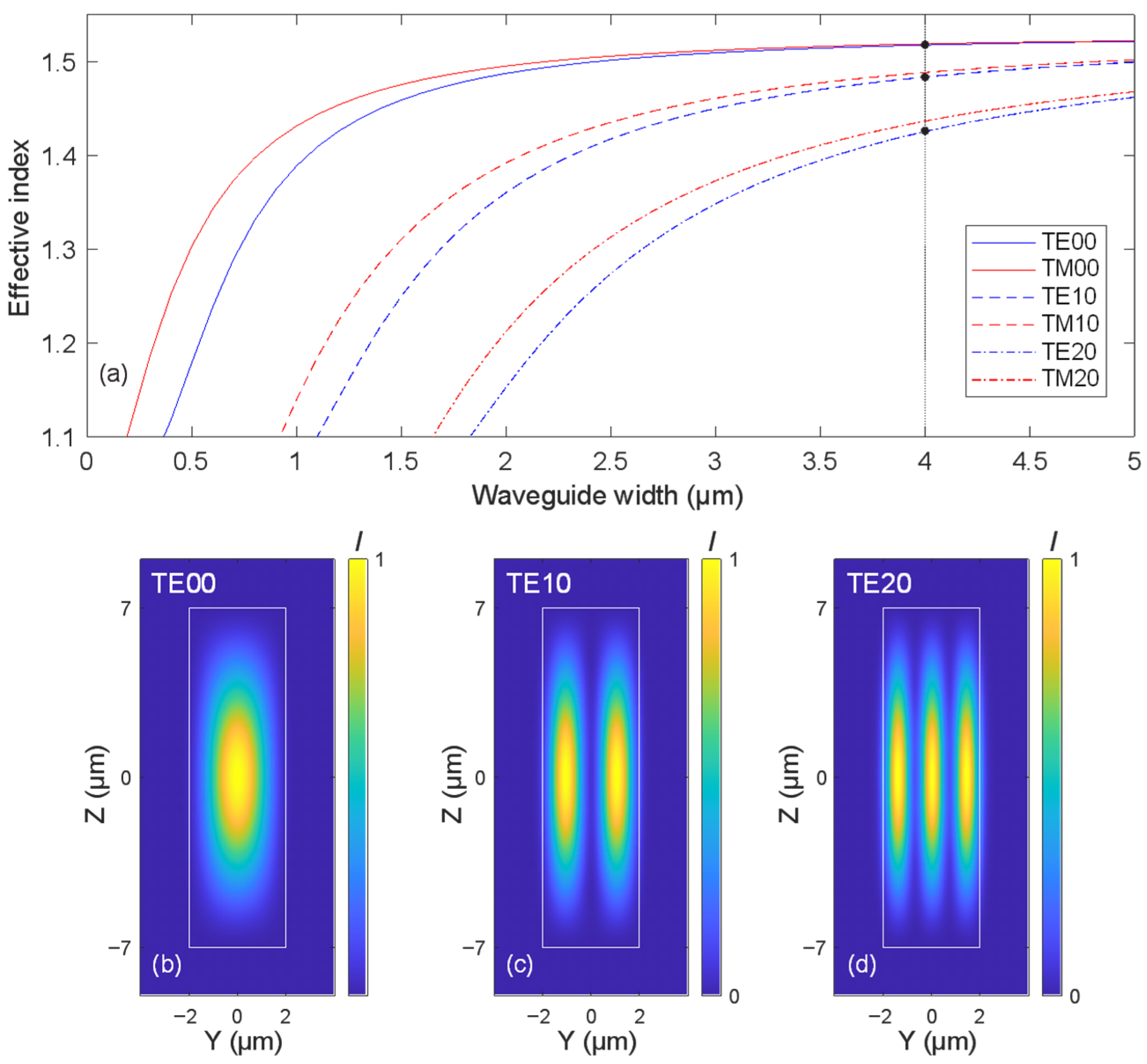 Figure 2d, respectively. As the waveguide width decreases, the separation between the effective indices of the adjacent modes increases. This trend is observed not only among higher-order TE modes but also between the TE and TM modes of the same order. The increased index spacing contributes to reduced intermodal coupling, which is advantageous for maintaining mode purity in compact photonic circuits. Similar trends apply when considering waveguides with a reduced height (Z-extent), with the distinction that the effective indices become lower and mode cutoffs slightly shift.