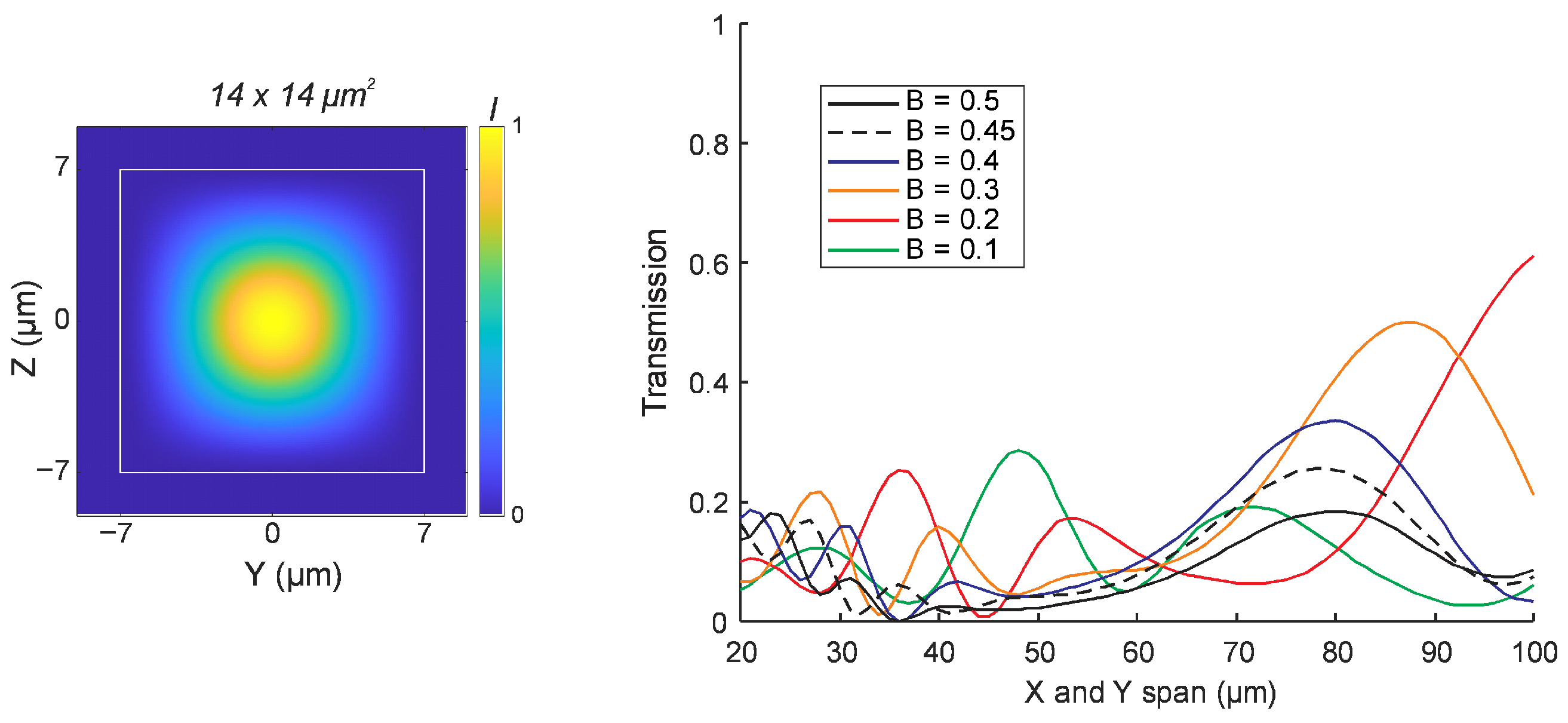 Left: Spatial intensity distribution of the fundamental mode in a 14 × 14 µm2 cross-section IP-DIP waveguide. Right: Simulated transmission through 90° waveguide bends as a function of bend span (X and Y) for various Bézier parameters (B = 0.1 to 0.5). Each curve represents a different B value, with B = 0.45 corresponding to a circular arc indicated by a dotted line. Simulations were performed at a wavelength of 1550 nm using a refractive index of 1.53 for the polymerized IP-DIP.