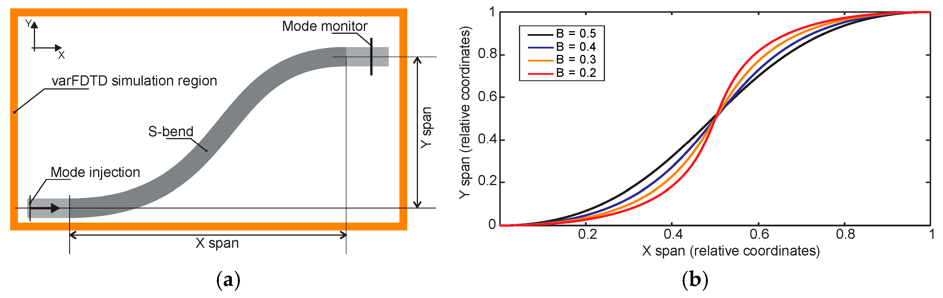 We now turn our attention to S-shaped bends in polymer waveguides or simply S-bends. A similar simulation approach is employed as in the previous section, allowing us to evaluate mode propagation and transmission characteristics under varying geometric parameters.