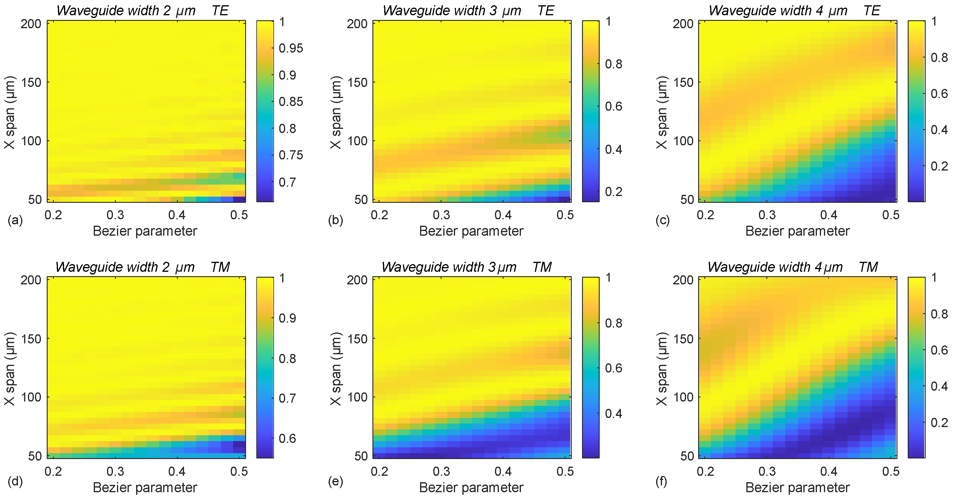 Figure 5a–c present two-dimensional colormaps where both the X and Y spans of the bend are varied equally, and the transmission of the fundamental mode is simulated. Regions of high transmission are indicated in yellow, allowing for the immediate visual identification of efficient bend configurations. Notably, sharp bends with spans below 50 µm can yield transmission values approaching unity. While careful design is required to achieve high transmission for the 4 µm waveguide, the 2 µm configuration exhibits a broad parameter space with consistently high transmission, slightly lower efficiency regions around 10 µm spans, and higher Bézier parameters. In general, lower values of the Bézier parameter lead to improved performance. An exception is observed for the 4 µm waveguide, where sharper bends with spans in the 25–30 µm range benefit from a Bézier parameter closer to 0.3. Achieving low-loss transmission through sharper bends with spans below 25 µm remains challenging for waveguides with widths of 4 µm and 3 µm. However, for 2 µm wide waveguides, careful selection of the Bézier parameter can enable transmission efficiencies approaching unity.