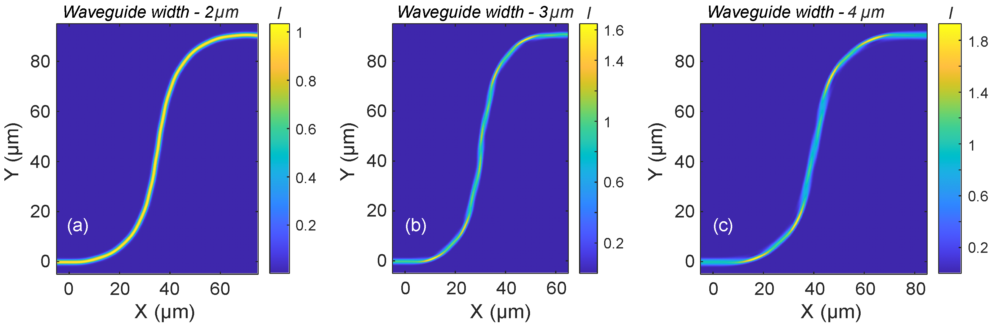 Intensity distributions in selected S-bend waveguides exhibiting greater than 99% transmission of the fundamental mode at a wavelength of 1550 nm and TE polarization, enabling a 90 µm lateral offset. (a) Waveguide width of 2 µm, Bézier parameter 0.2, and length of 70 µm; (b) waveguide width of 3 µm, Bézier parameter 0.2, and length of 60 µm; (c) waveguide width of 4 µm, Bézier parameter 0.2, and length of 80 µm.