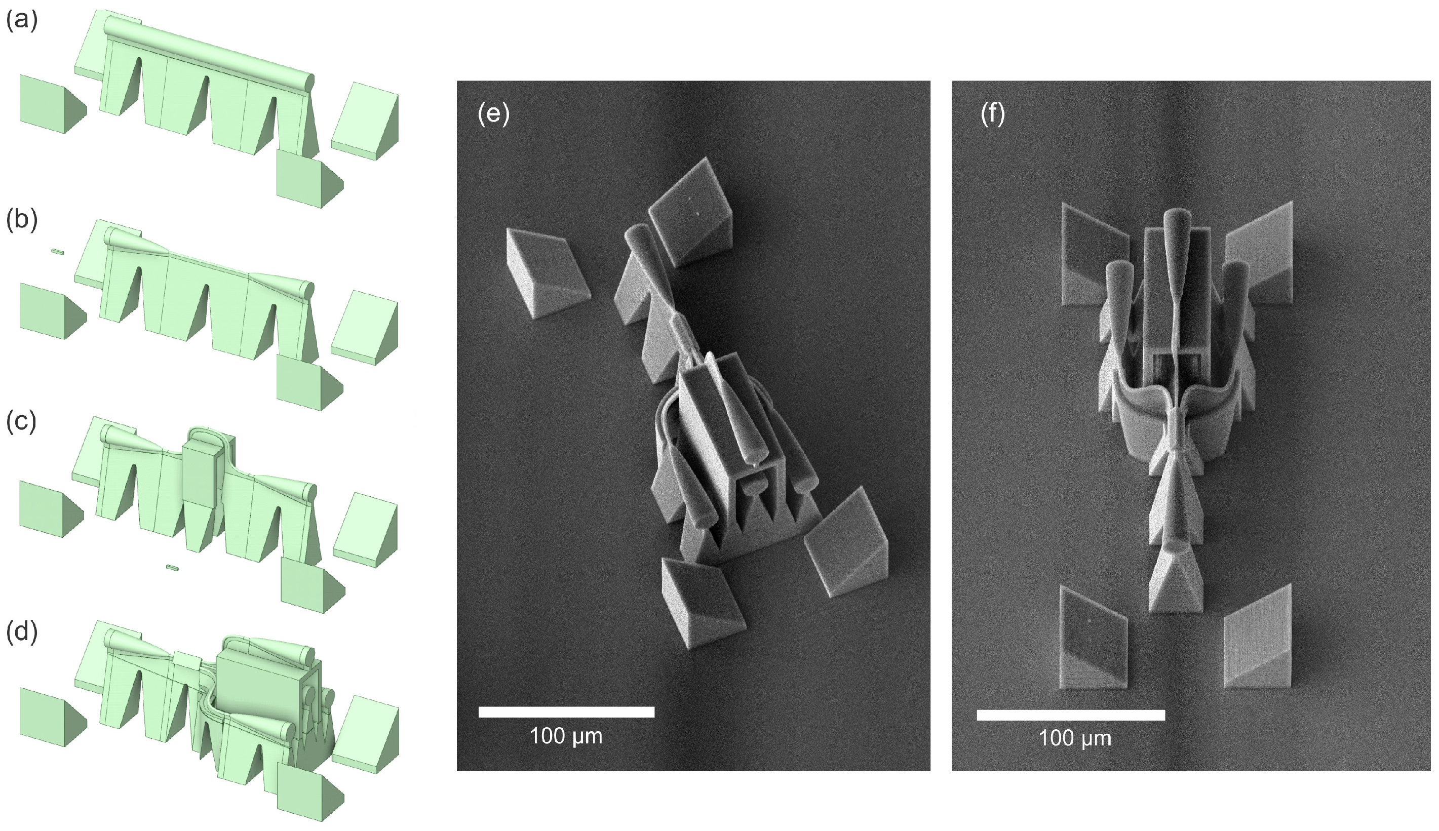 Design evolution and fabricated structures of the 1 × 4 3D splitter. (a) Straight waveguide with a 15 µm diameter. (b) Waveguide with two tapers reducing the central section to a 2 µm diameter. (c) Waveguide with two S-bends introducing a 32 µm lateral offset. (d) Complete design of the 3D-splitter incorporating a triangular cross-section MMI. (e,f) SEM images of the fabricated 3D splitters with the integrated alignment features.