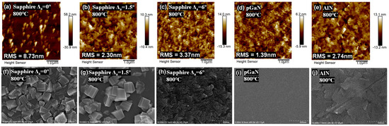 This effect is corroborated by AFM (5 × 5 μm2 scan) and SEM images (with a 500 nm scale bar), which reveal the direct impact of substrate-film lattice mismatch on the macroscopic grain structure and surface morphology [19,20]. For instance, the film grown on c-plane sapphire without an off-cut angle exhibits significantly larger surface fluctuations. Its root mean square (RMS) roughness and the peak-to-valley height difference (as indicated in the AFM images) are approximately 4–5 times greater than those of films grown on other substrates under the same conditions. The underlying reason for this pronounced roughness will be discussed in a subsequent section.