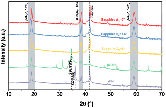 The thermal mismatch was derived from the difference in the in-plane coefficients of thermal expansion (CTE) between the substrates and the gallium oxide films. The employed CTE values were approximately 5.0 × 10−6/K for sapphire, 4.0 × 10−6/K for both β-Ga2O3 and ε-Ga2O3, 5.59 × 10−6/K for GaN, and 4.2 × 10−6/K for AlN. It is noted that the actual mismatch may vary slightly depending on specific growth conditions and film thickness.