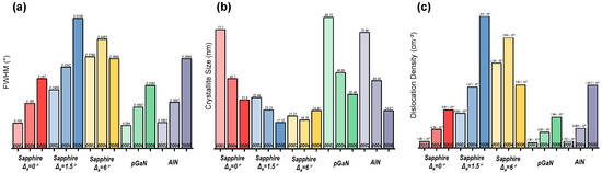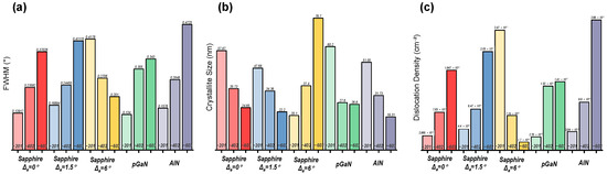 Specifically for the 0°, 1.5° sapphire, pGaN, and AlN substrates, the (0002) plane exhibits the smallest FWHM, the largest crystallite size, and the lowest dislocation density, indicating the highest crystalline perfection near this orientation. The degradation in FWHM, crystallite size, and dislocation density for the (0004) and (0006) planes confirms that crystal quality deteriorates progressively along the c-axis. In summary, while the film growth is preferential along the [0002] direction, significant stress inhomogeneity persists, necessitating further optimization of growth parameters to mitigate stress and reduce dislocation densities.
