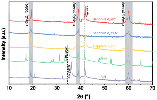 The crystallinity of the ε-Ga2O3 films was critically dependent on the underlying template. X-ray diffraction (XRD) 2θ-ω scans were employed to assess the phase purity, as shown in Figure 5.