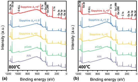 XPS survey spectra (0–1200 eV) of gallium oxide films grown under ten different conditions (combining two temperatures and five substrates): (a) 800 °C and (b) 400 °C.