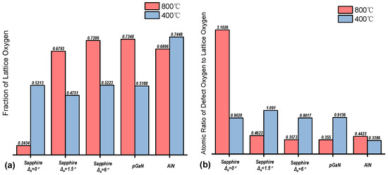 Figure 9 summarizes the quantitative results, showing the lattice oxygen percentage and the adsorbed-oxygen-to-lattice-oxygen ratio. For the film grown at 800 °C on the sapphire substrate without an off-cut, the O 1s spectrum exhibits a lower lattice oxygen percentage and a higher adsorbed-oxygen-to-lattice-oxygen ratio. This indicates a higher density of surface defects, which is consistent with its inferior surface morphology observed by AFM/SEM. Meanwhile, samples grown at 400 °C generally show a higher proportion of adsorbed oxygen. The significantly higher proportion of adsorbed oxygen species in the XPS O 1s spectra of the 400 °C samples indicates a higher density of surface sites with high reactivity.