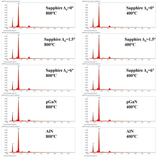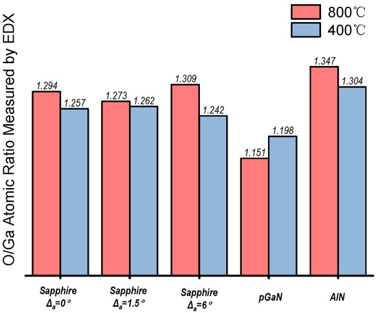 Figure 11 displays a statistical graph of the O/Ga atomic ratio for all samples, offering an intuitive visualization of the oxygen deficiency and its correlation with both growth temperature and substrate type. The films grown at 800 °C exhibit a higher O/Ga atomic ratio compared to those grown at 400 °C, indicating a composition closer to the ideal stoichiometric value of 3:2 and thus higher quality gallium oxide films [21]. Among the different substrates at 800 °C, the AlN substrate yields the best result (closest to stoichiometry), while the pGaN substrate gives the poorest. This trend aligns with the lattice and thermal mismatch data presented earlier: pGaN has the largest mismatch with Ga2O3, while AlN has a relatively smaller mismatch. For the sapphire substrates, the film on the 6° off-cut substrate shows a superior O/Ga ratio at 800 °C, whereas the 1.5° off-cut substrate is more favorable at 400 °C.