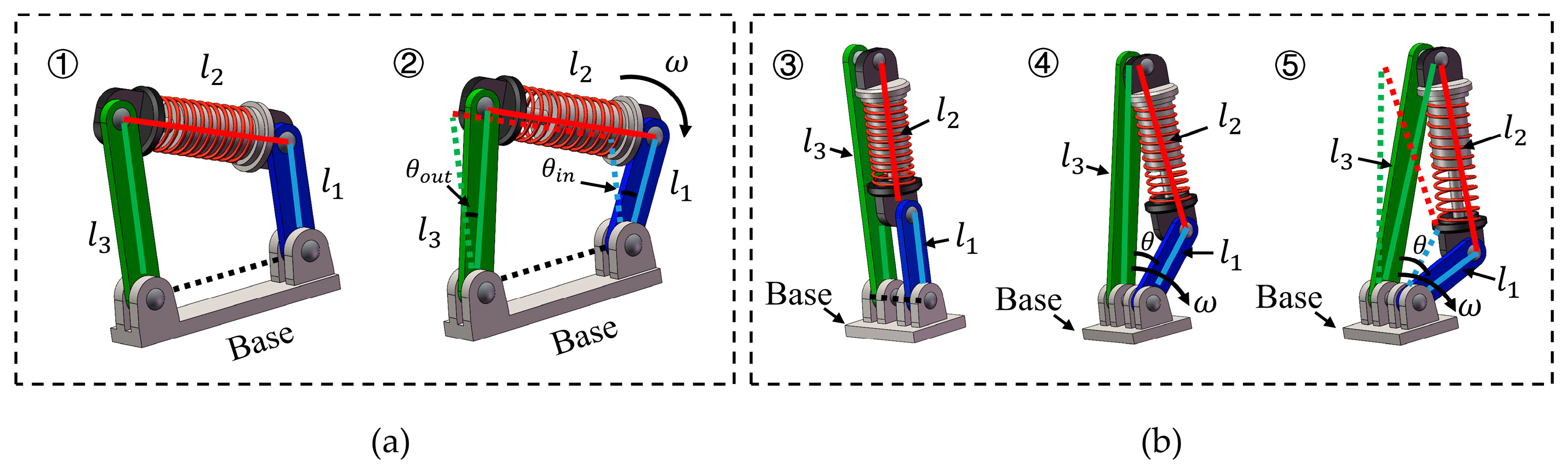 27]. In this study, the completeness of this concept is briefly reiterated and the parameters are optimized for subsequent mechanical design. Although the mechanism is topologically a four-bar linkage, in our specific configuration the ground link is reduced to zero-length, causing the input and output links to share a common rotational axis. This special-case geometry allows the system to be treated as a three-link structure for analytical convenience, without altering its underlying kinematic class. Such a simplification is consistent with the principle that, in a four-bar linkage, when the ground link becomes zero-length, the speed and torque ratios approach unity and the mechanism exhibits singular behavior—a condition previously noted in ref. [