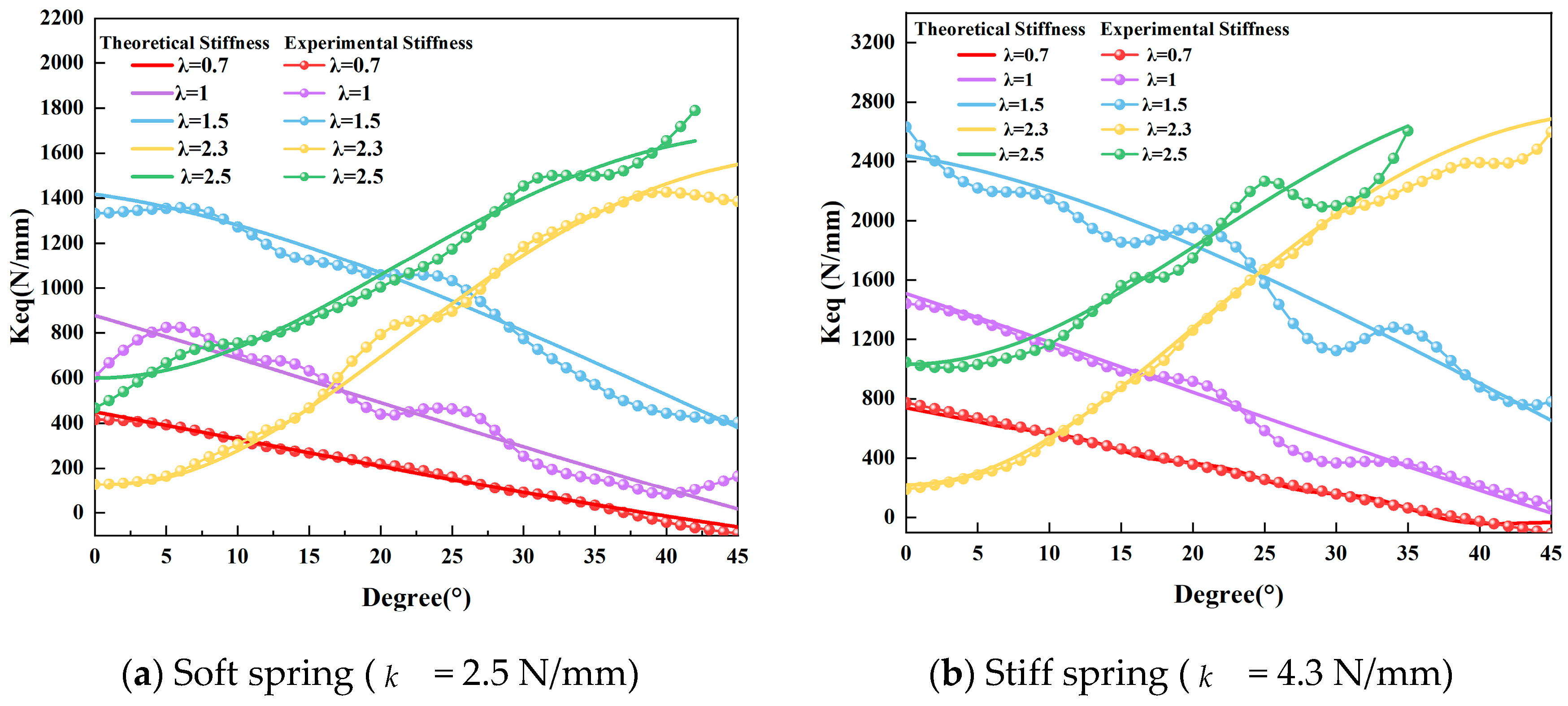 We can observe that the equivalent stiffness in Equation (6) is mathematically partitioned into two distinct components, which are determined by the spring coupling mechanism and the preload force provided by the spring.