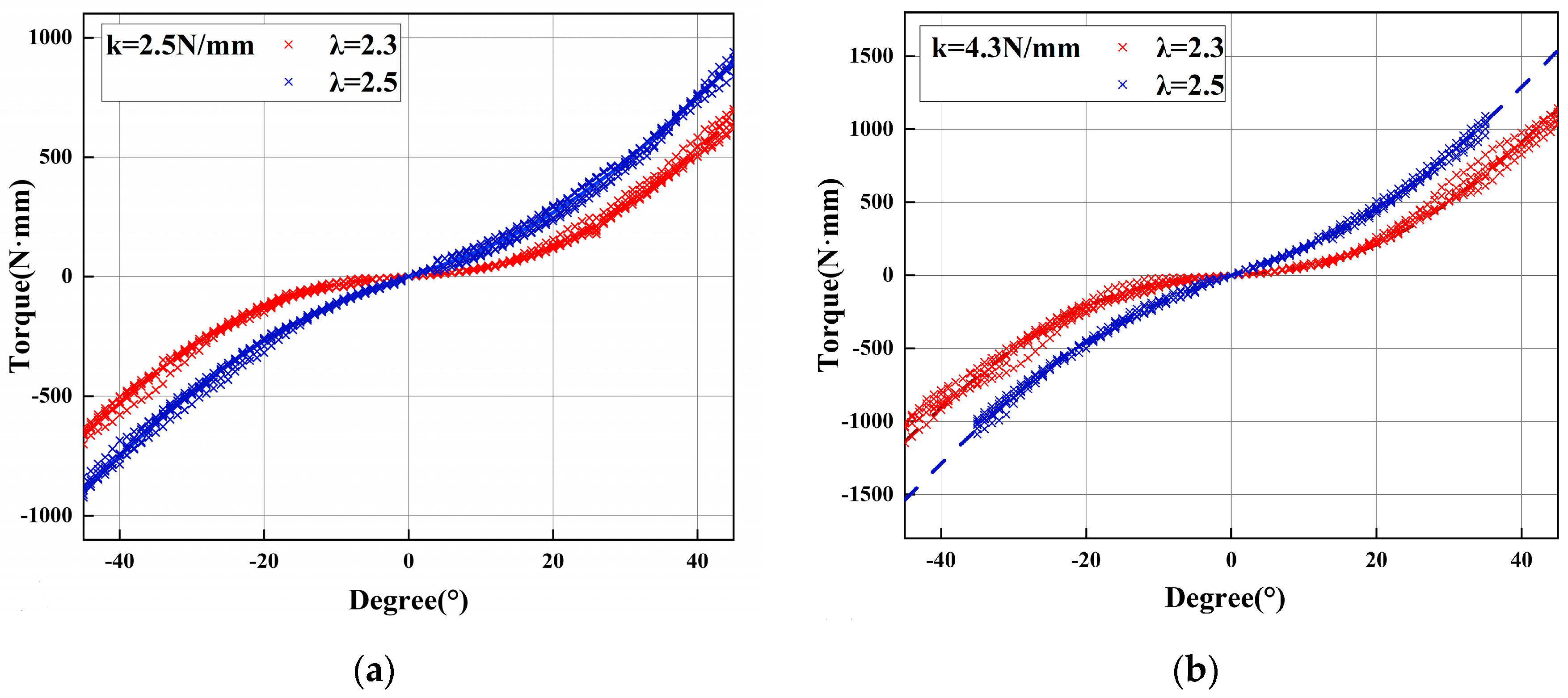 Figure 10a,b, the monotonic torque–angle relationship confirms stable system behavior, while differences among the curves highlight how spring stiffness