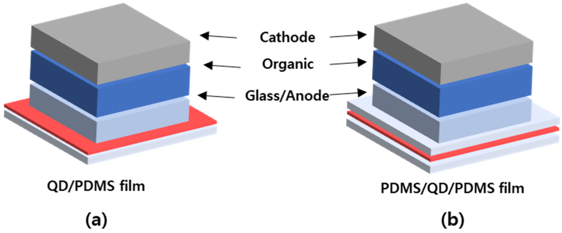 Resultingly, we utilized irreversible and reversible methods to attach and detach the QD/PDMS film and blue OLED to the exterior of a blue OLED device to evaluate its light extraction and color conversion properties.
