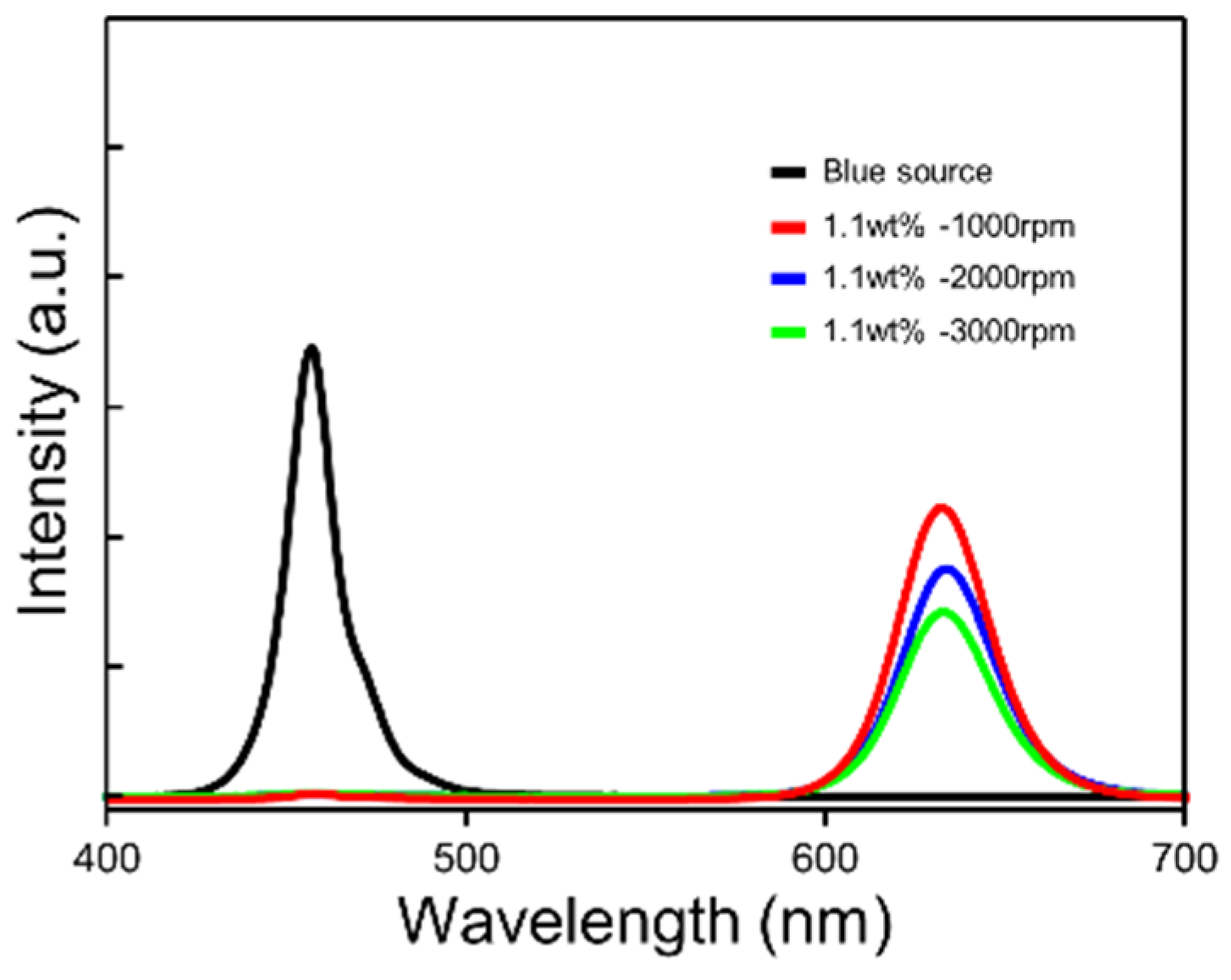 We used dispersed red-QD solution in hexane to make QD/PDMS composite film as the color conversion layer. A total of 1.1 wt% of QD solution was mixed with 1 g of PDMS base in the glass dish by mechanically mixing. After that, 0.3 g of PDMS curing agent was poured in a glass dish for 1 min mixing. The QD solution was spin-coated on the supporting layer at 1000, 2000, and 3000 rpm. And then this layer was cured at 80 °C for 1 h. Finally, we completed a QD/PDMS single-layer film. The multiple-layer film (PDMS/QD/PDMS) comprised one more bare PDMS layer, which was spin-coated on the QD/PDMS layer under equal conditions. So, we designed a top PDMS layer to cover the QD layer to keep its flexibility, as in