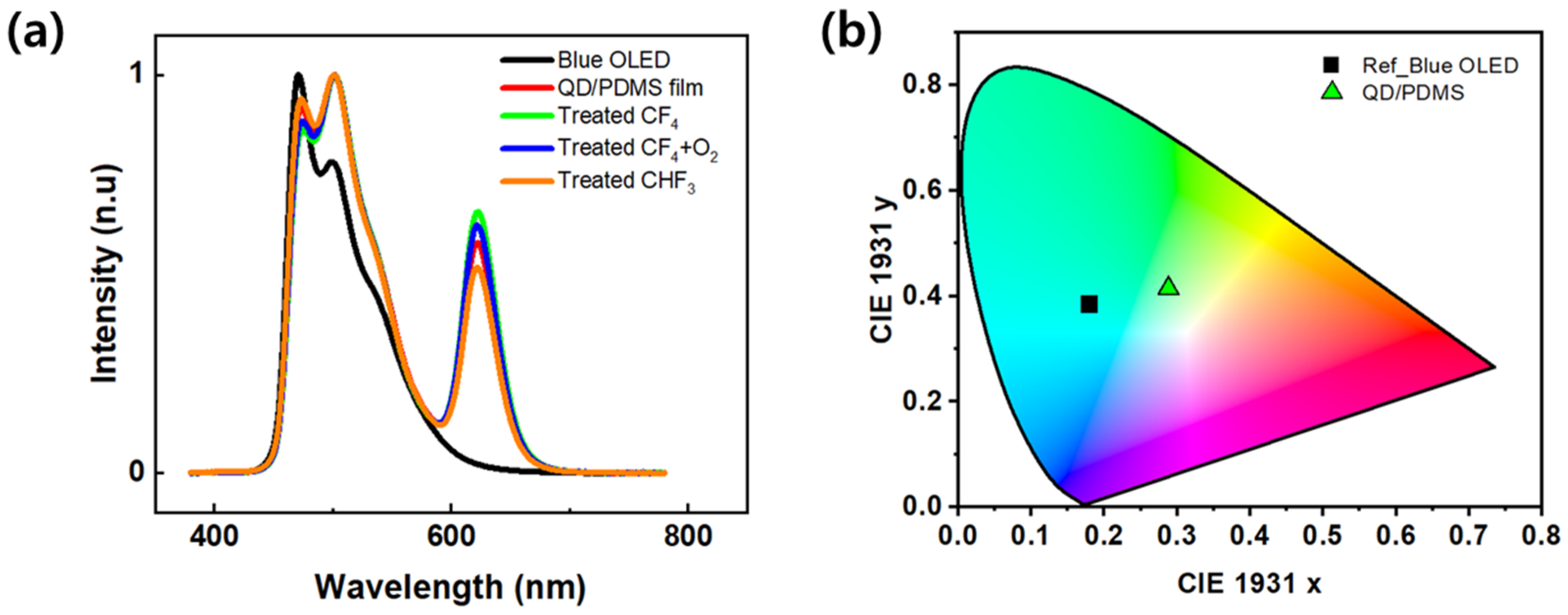 Figure 6a shows the EL spectrum of an OLED with a QD/PDMS composite film applied under different RIE processing conditions. The reference blue OLED exhibits typical blue-light emission characteristics with an emission peak at 471 nm. In contrast, the device with the QD/PDMS composite film clearly showed an emission peak at around 620 nm. This is attributed to the color conversion effect by the red QDs, indicating that the short-wavelength light from the blue OLED was absorbed by the QDs within the film and re-emitted as longer-wavelength red light. The peak intensity around 620 nm in the EL spectrum was stronger in the structure treated with RIE than in the QD/PDMS composite film.