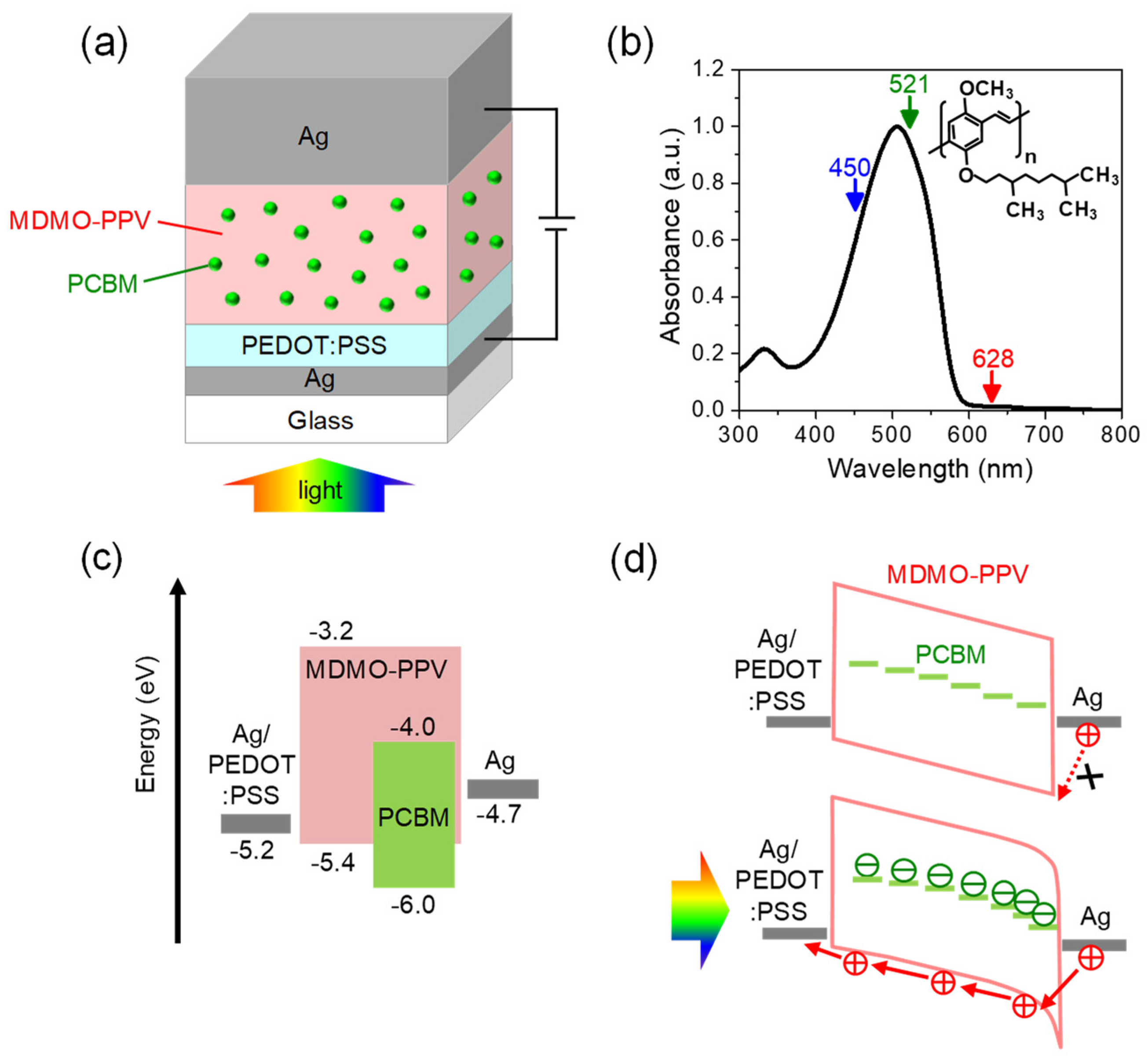 Figure 1c, the relatively deep highest occupied molecular orbital level of MDMO-PPV (approximately −5.4 eV) facilitates the formation of a suitable Schottky barrier with the top Ag electrode. To induce photomultiplication, a small fraction of the fullerene derivative [6,6]-phenyl-C