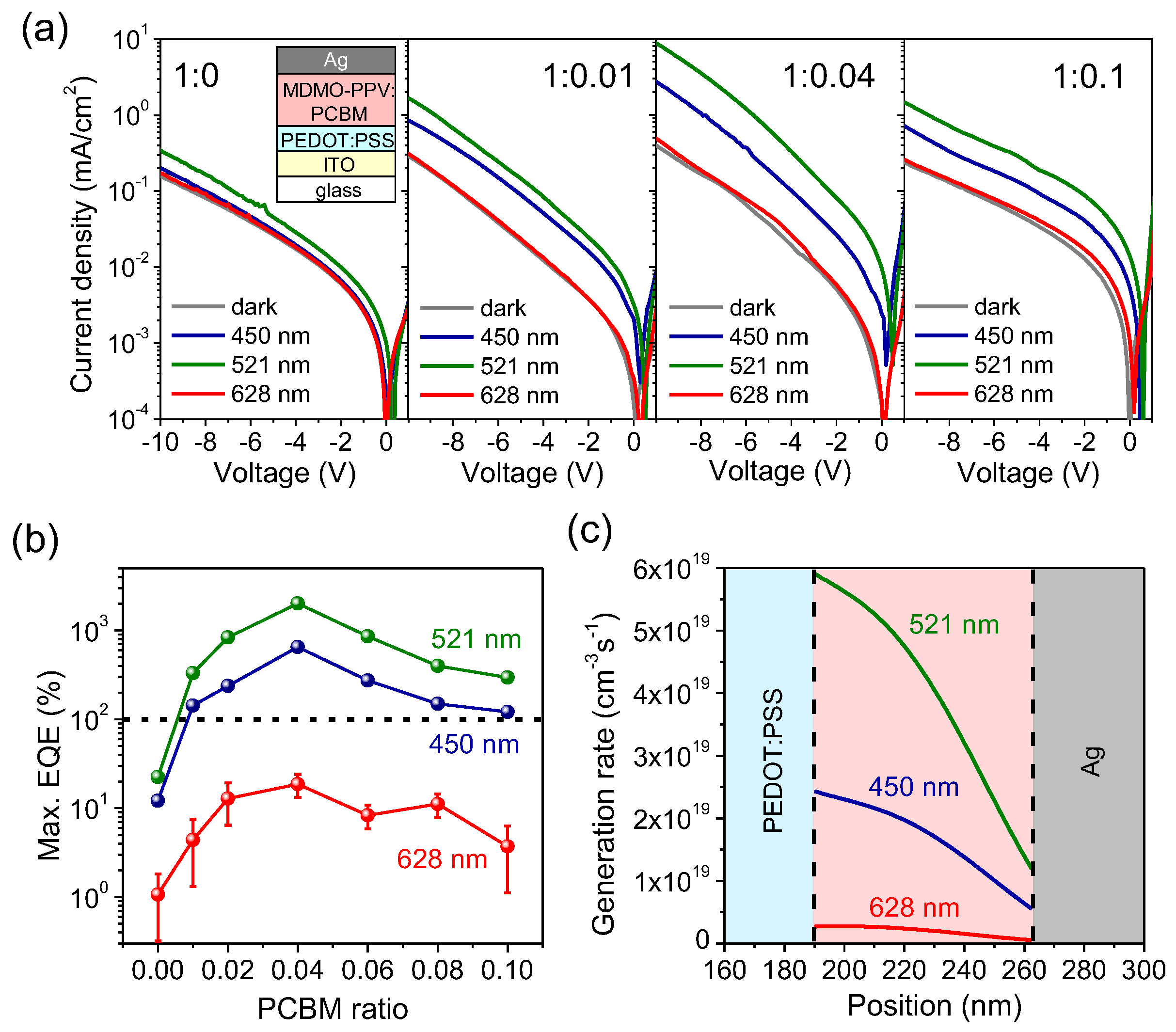 22]. Across all compositions, the strongest photoresponse consistently occurs under 521 nm illumination, close to the absorption maximum of MDMO-PPV. In contrast, excitation at 628 nm—within the absorption tail—produces minimal response in the absence of photomultiplication. This wavelength dependence can be quantitatively explained by the local exciton generation rate near the Ag/MDMO-PPV:PC