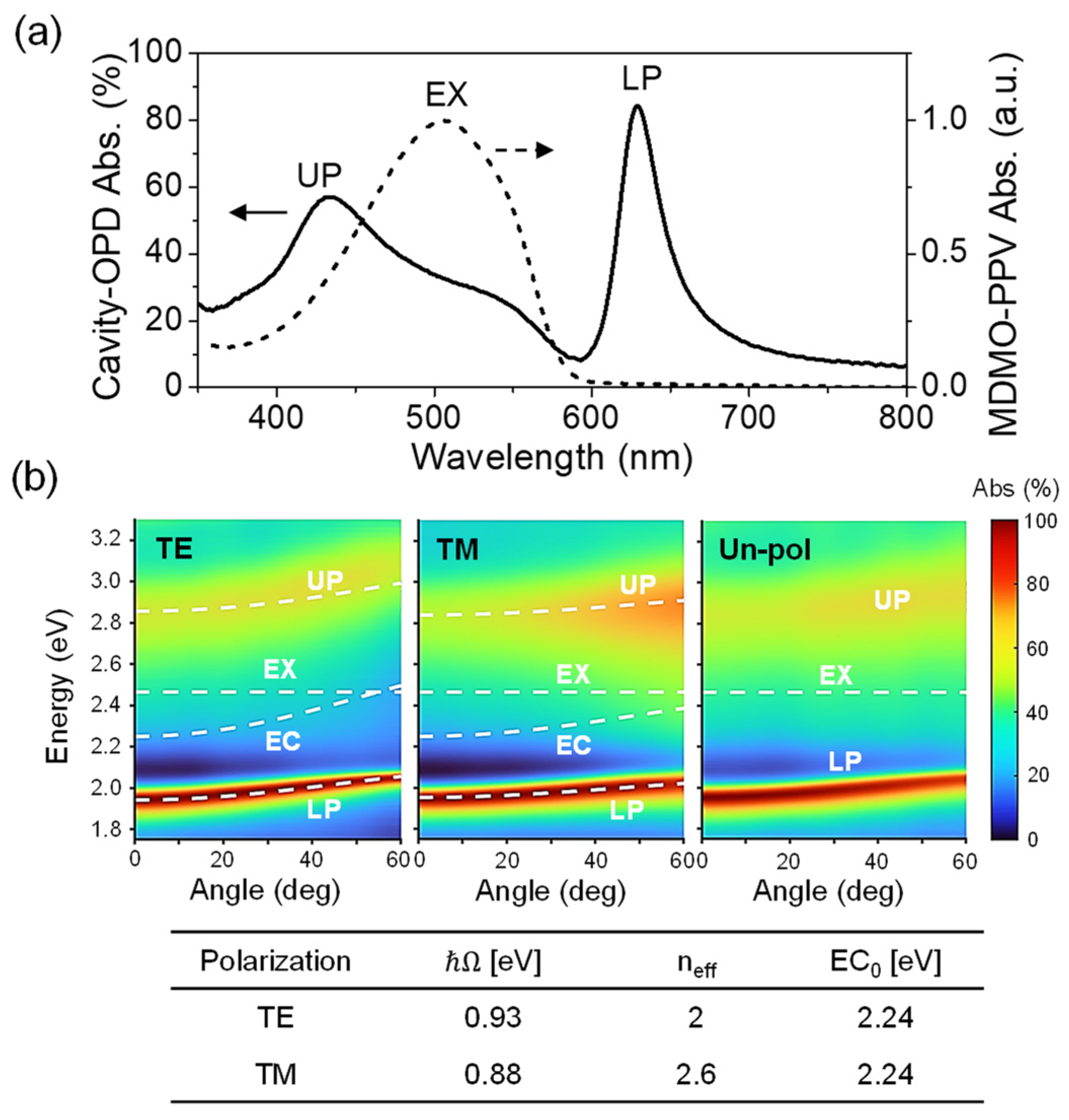 1—Reflectance. The spectrum clearly reveals the LP and upper polariton (UP) modes flanking the exciton resonance (EX) of MDMO-PPV at 504 nm (2.46 eV), with the LP mode tuned to 628 nm within the polymer’s absorption tail. Angle-resolved absorption spectra under TE, TM, and unpolarized illumination are shown in