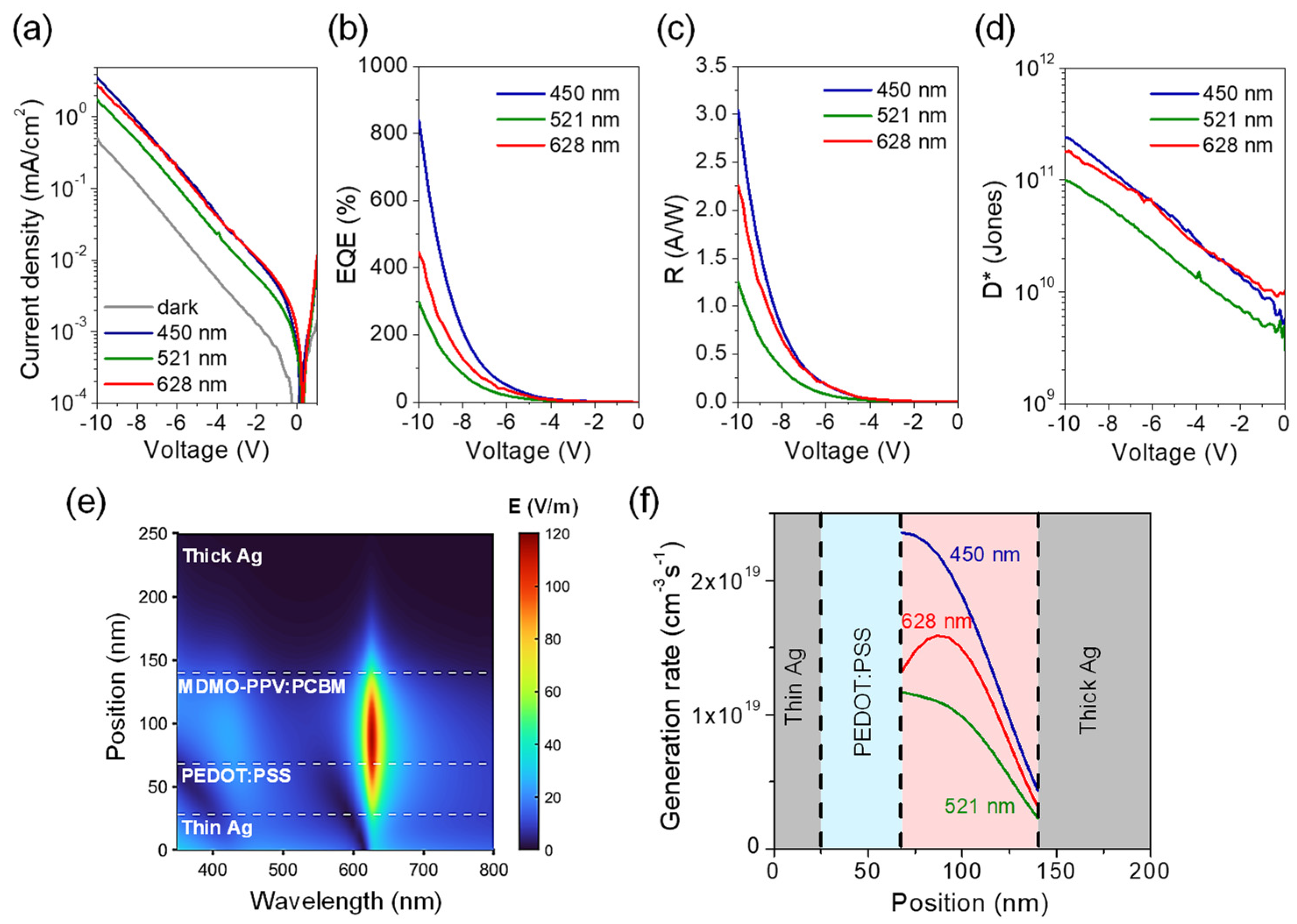 Figure 4b–d). Notably, at 628 nm, corresponding to the LP mode, the EQE reaches 445% at −10 V, demonstrating efficient photomultiplication beyond the intrinsic absorption band of MDMO-PPV. A summary of the cavity OPD characteristics at selected illumination wavelengths is provided in