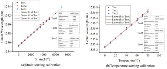Given that the FBG’s center wavelength is modulated by both ambient temperature and strain, temperature compensation for strain measurements is required in practical applications. The temperature compensation method involves placing a temperature sensor near the strain sensor. The specific compensation process is described by Equations (3) and (4):