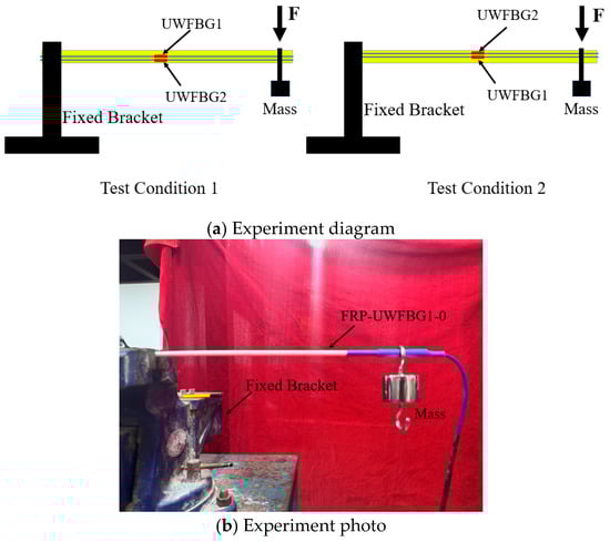 Figure 5 shows the schematic diagram and photograph of the sensor direction recognition test. In the figure, one end of the sensor is fixed to the bracket, while the other end suspends a mass block. In the sensor, the ultra-weak FBG on the sensor’s central axis is designated as UWFBG1, and the direction-sensing ultra-weak FBG is designated as UWFBG2. We established two test conditions as shown in Figure 5a: Condition 1: the direction of force is closer to the UWFBG1 side; Condition 2: the direction of force is closer to the UWFBG2 side. Each operating condition includes two load levels: the first load level has a mass of 200 g, and the second load level has a mass of 700 g. In fact, the first and second test conditions represent two distinct scenarios where the force applied to the sensors is directed oppositely. Theoretically, under the first test condition, the strain measured by UWFBG1 is positive and increases with increasing load; the strain measured by UWFBG2 is negative and decreases with increasing load. Under the second test condition, due to the change in the direction of force application, both the strain measured by UWFBG2 and UWFBG1 are positive and increase with increasing load.
