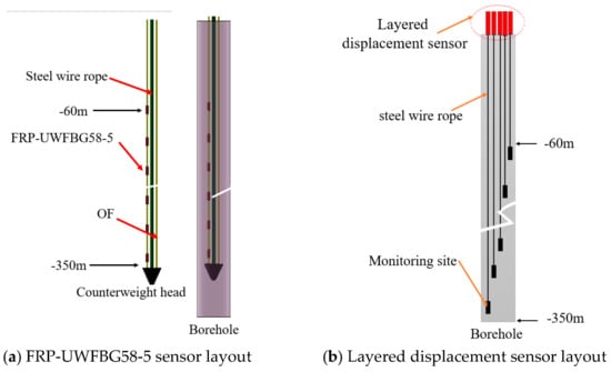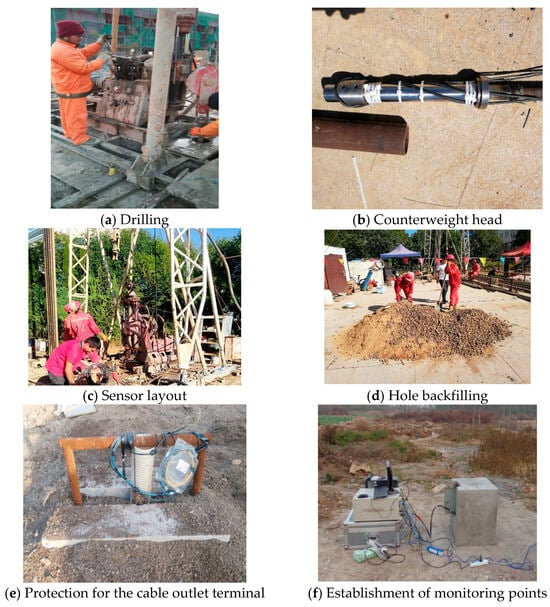 Figure 7 shows the physical images of the layered displacement sensor and the FRP-UWFBG58-5 sensor. The accuracy and measurement range of the layered displacement sensor are ±0.5 mm and 50 mm, respectively, and the accuracy and measurement range of the FRP-UWFBG58-5 sensor are ±0.1 mm and 30 mm, respectively. Figure 8 shows photographs of the sensor field deployment. The installation process comprises six steps: drilling, counterweight head installation, sensor deployment, borehole backfilling, sensor cable end protection, and monitoring station establishment. The mass of the counterweight head is 1000 g. The FRP-UWFBG58-5 sensor, optical fiber (OF), and steel wire rope are secured to the counterweight head, ensuring the sensor remains in a straight line at all times. Based on long-term underground temperature observation data, temperatures at depths ranging from 46 to 500 m below the surface remain largely unaffected by seasonal temperature fluctuations and are essentially constant. Therefore, this monitoring plan does not include the installation of temperature sensors for environmental temperature compensation. Furthermore, when the length of the FRP-UWFBG58-5 sensor reaches 350 m, multiple UWFBG sensors detect the same temperature field within a certain range, and since at least one UWFBG sensor is not affected by soil deformation, this sensor can serve as a temperature sensor to compensate for the temperature of other sensors.