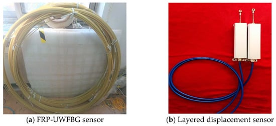 FRP-UWFBG58-5 sensor and layered displacement sensor deployment diagrams.