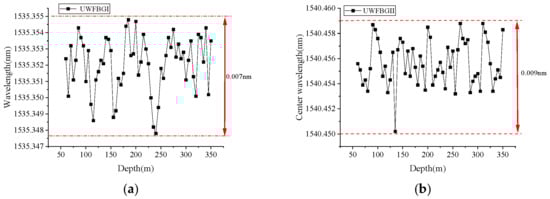 Center wavelength distribution of UWFBGII in the FRP-UWFBG58-5 sensor. (a) Center wavelength distribution without temperature compensation, (b) center wavelength distribution with temperature compensation.
