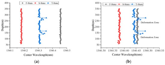 In the FRP-UWFBG58-5 sensor, there are two ultra-weak FBG arrays: one is for displacement measurement, named UWFBGI, and the other is for direction identification, named UWFBGII. Figure 9 shows the center wavelength distribution of the two ultra-weak FBG arrays in the FRP-UWFBG58-5 sensor; it can be seen that the center wavelengths of the fiber gratings within each weak-light fiber grating array are essentially identical, with the UWFBGI array having a center wavelength range of [1535.3476 nm, 1535.3551 nm] and the UWFBGII array having a center wavelength range of [1540.4503 nm, 1545.4592 nm]. Figure 10 and Figure 11 show the center wavelength distribution of the ultra-weak FBGs in the FRP-UWFBG58-5 sensor before and after temperature compensation at three different states. The first state (named as F-State) is when the sensor was outdoors in a free state and the outdoor ambient temperature was 32.3 °C; the second state (named as S-State) is when the FRP-UWFBG58-5 sensor was installed into the borehole, and the borehole was not backfilled, and the borehole temperature was 20.7 °C; and the third state (named as T-State) is at twenty-four hours after backfilling the borehole and the temperature inside the hole was 24.4 °C. Here, traditional resistance temperature detectors such as the PT100 are used for ambient and borehole temperature measurements.