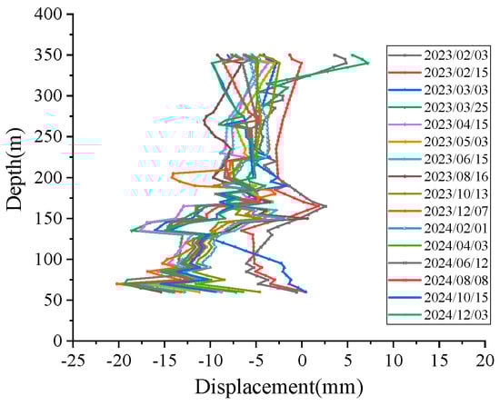 One month after backfilling the borehole, the backfill material within the hole became substantially compacted under its own weight and lateral loading from the surrounding soil, achieving tight coupling with the in situ soil. We initiated long-term monitoring of soil settlement using data from the first test conducted on 3 February 2023 as the baseline value. In subsequent testing, since only the displacement sensors at the 75 m, 150 m, and 265 m points operated normally, we conducted comparative analysis solely on the displacement measurements at these three locations. Figure 13 shows the displacement comparison curves. Monitoring data from the FRP-UWFBG58-5 sensor and layered displacement sensor both indicate that from January to March in 2023, the strata were in a rebound state with settlement rates tending to decrease. After May in 2023, the strata entered a compression state, with settlement rates gradually increasing. The trends observed in the monitoring data from the FRP-UWFBG58-5 sensor and layered displacement sensors were largely consistent. The final settlement values measured by the layered displacement sensor are −21.67 mm, −6.48 mm, and −6.45 mm at the 75 m, 150 m, and 265 m locations, and those measured by the FRP-UWFBG58-5 sensor are −19.07 mm, −8.35 mm, and −9.10 mm as listed at the 75 m, 150 m, and 265 m locations in Table 5. One of the primary reasons for the discrepancy between monitoring data from the ultra-weak FBGs and layered displacement sensor stems from lateral deformation of the ultra-weak fiber optic grating sensors caused by lateral compression from backfill material. Figure 14 shows the distribution of deep soil displacement from February 2023 to December 2024, with sampling points spaced at 5 m intervals measured by the FRP-UWFBG58-5 sensor. Overall, the test results above indicate that both the layered displacement sensor and the FRP-UWFBG58-5 sensor demonstrate high accuracy in fitting stratum deformation patterns, both capable of intuitively and accurately reflecting soil deformation characteristics. The unique advantage of the ultra-weak FBG array lies in its ability to characterize stratum changes across the entire pore space and cross-section, enabling analysis of deformation patterns at any stratum level.