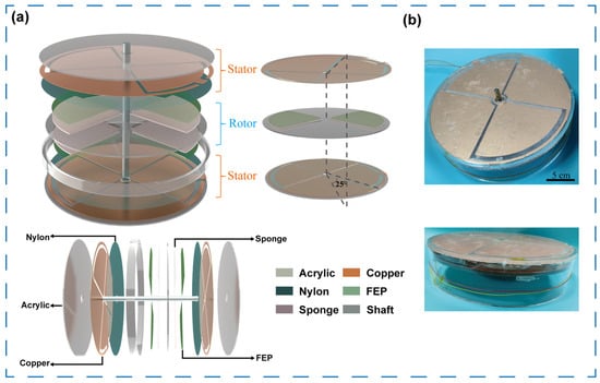 Diagram depicting the structure of the TENG. (a) 3D schematic diagram of the TENG, composed of a rotator and two stators. (b) Photographs of the TENG.