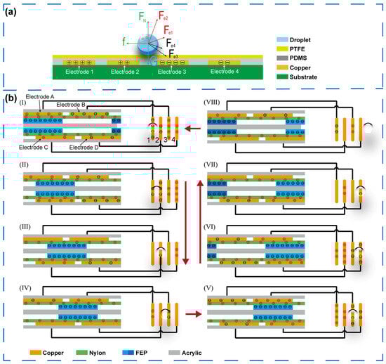 Microfluidic technology, which enables precise manipulation of fluid volumes at the microliter to nanoliter scale, has become a popular method in biochemical analysis [1,2], environmental monitoring [3], drug synthesis [4,5], and high-throughput screening [6,7]. Droplet-based microfluidics, in particular, treats each droplet as an independent microreactor, facilitating programmable chemical reactions, parallelized diagnostics, and high-throughput analysis with minimal reagent consumption [8]. The rapid development of portable lab-on-chip and point-of-care testing devices has further underscored the need for compact, precise, and energy-efficient droplet actuation systems capable of autonomous operation [9,10]. Various droplet actuation strategies have been developed, including optical [11,12], thermal [13], acoustic [14], magnetic [15,16], and electric [17,18]. Among these, electrically controlled droplet technology has emerged as the most widely used technique due to its fast response, low power consumption, and ease of digital control [19]. Nevertheless, traditional droplet manipulation systems rely on external high-voltage sources (typically 60~1000 V) and complex electronic circuits to sustain actuation, which significantly increases system cost and design complexity [20]. This dependency limits their use in miniaturized, portable, and wearable devices.