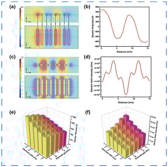 Simulation of microfluidic chip. (a) The simulated distribution and (b) the extracted data of electric potential. (c) The simulated distribution and (d) the extracted data of electric field intensity. (e) The maximum electric potential and (f) the maximum electric field intensity versus the electrode width and gap.