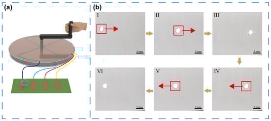To further demonstrate sustained and synchronized driving capability of the self-powered microfluidic system, a circular path microfluidic chip consisting of 36 electrodes was designed and fabricated. Each electrode was a rounded rectangle with a width of 2 mm and a length of 5 mm, arranged at an angular interval of 10°, forming an annulus with an inner diameter of 40 mm and an outer diameter of 50 mm. As illustrated in Figure 8a, the chip was connected to the TENG to establish a self-powered microfluidic system, and three droplets of deionized water (100 μL each) were dispensed at different positions along the circular path. The picture in Figure 8b shows that all droplets were simultaneously driven in a clockwise direction while maintaining a nearly constant gap throughout the motion. Moreover, as recorded in Movie S4, under both low and high rotation speeds of the TENG, the three droplets were be stably propelled along a circular trajectory, and the motion direction can be conveniently reversed by changing the rotation direction of the TENG. These results confirm that the developed system achieves reliable, long-term droplet circular movement with fully reversible directional control.