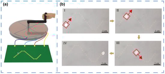 The triboelectric nanogenerator (TENG), which converts mechanical motion into electricity through the combined effects of triboelectrification and electrostatic induction, offers an elegant solution to this problem [21,22,23,24]. Distinguished by their high output voltage, low current, light weight, and simple fabrication, TENGs provide an inherently safe and energy-autonomous power source for droplet manipulation [25]. Their ability to harvest energy from ubiquitous mechanical motions, including vibration, rotation, and human activity, makes them ideal for self-powered microfluidic applications [26,27,28]. In this regard, pioneering studies have explored the feasibility of TENG-driven droplet manipulation. Nie et al. demonstrated a freestanding-mode TENG driving a liquid-based micro vehicle, while its unidirectional motion mode and linear trajectory restricted its versatility [29]. Yu et al. later developed a rotational TENG with an electric brush commutation unit that enabled droplet splitting and merging; however, this architecture increased system complexity and required additional switching circuits to reverse the droplet movement direction [30]. More recently, Li et al. proposed a self-powered microfluidic system that drives droplets to move in a two-dimensional plane; however, the TENG electrodes were directly mapped one-to-one to those of the microfluidic chip, limiting the ability of long-range droplet transport [31]. These studies collectively indicate that current TENG-based microfluidic systems still suffer from limited flexibility and inadequate capability for scalable long-range droplet transport along complex trajectories without auxiliary circuit switching. Therefore, there is an urgent need for a TENG architecture that can independently generate stable periodic high-voltage signals while supporting versatile microfluidic path movement.