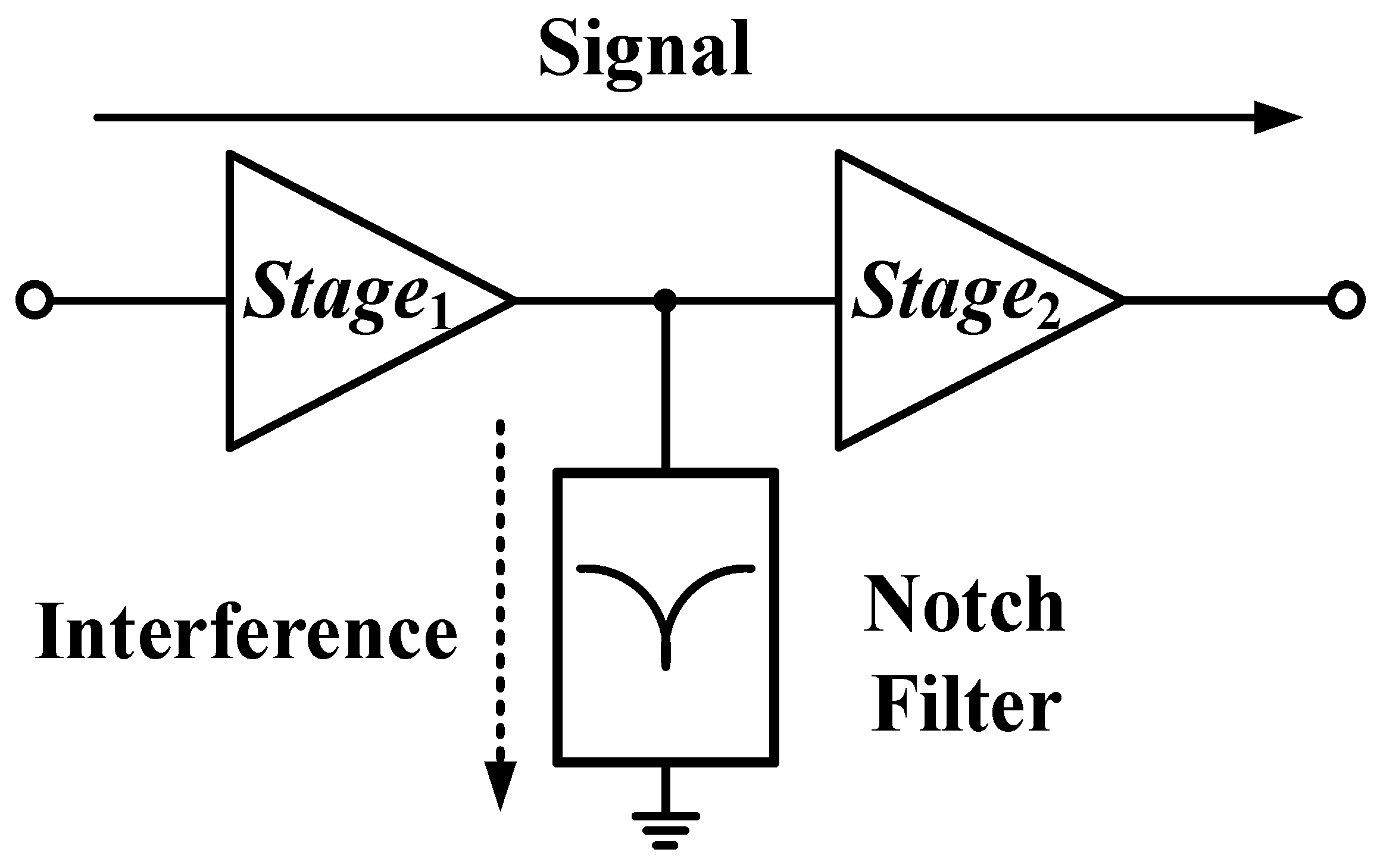 - Lin, J.-Y.; Chiou, H.-K. Power-constrained third-order active notch filter applied in IR-LNA for UWB standards. IEEE Trans. Circuits Syst. II Exp. Briefs 2011, 58, 11–15. [Google Scholar] [CrossRef]