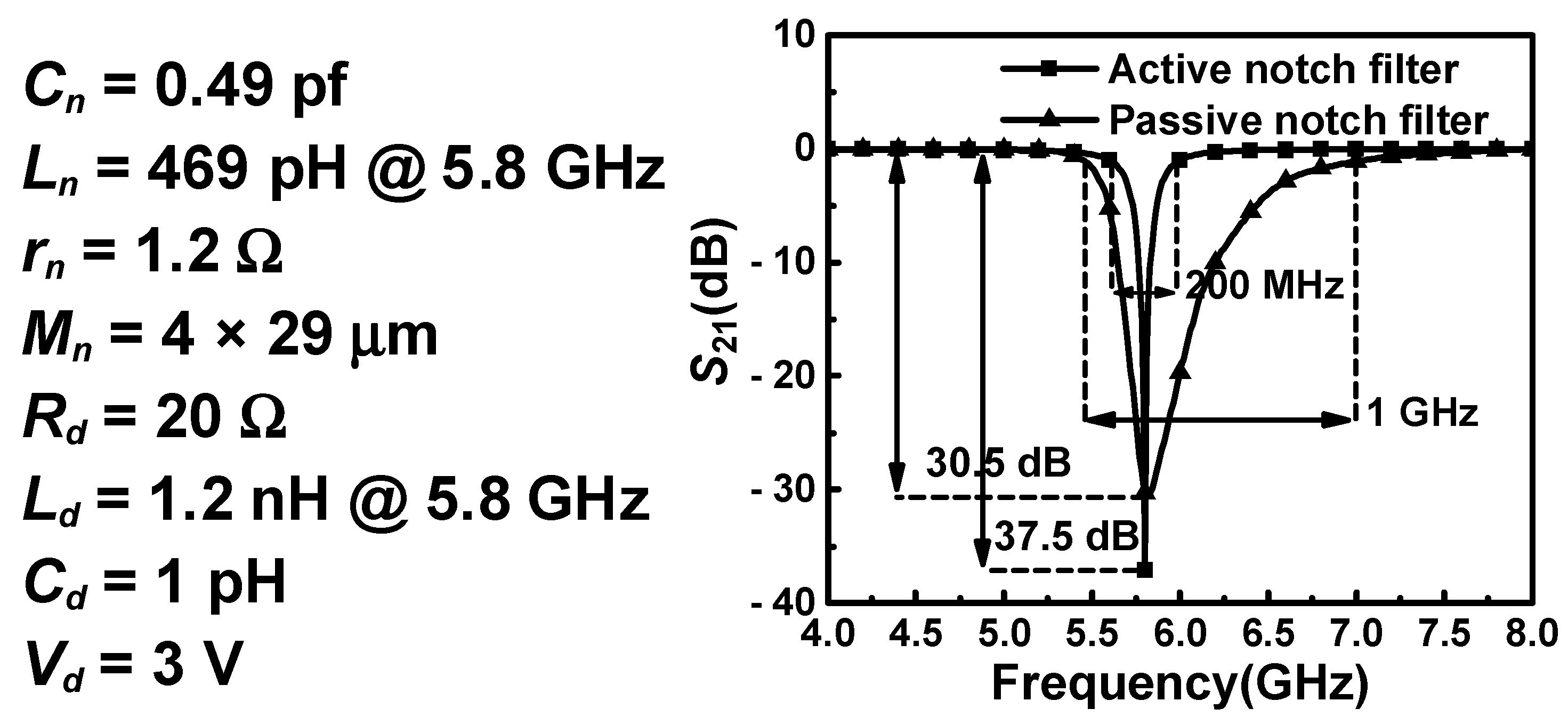 | [16] | 0.18 μm CMOS | Third-order active notch filter | 1.2–9.5 | 14.7 | 5.3 | --- | 35.7@ 5.8 GHz | 16 | 0.51 |