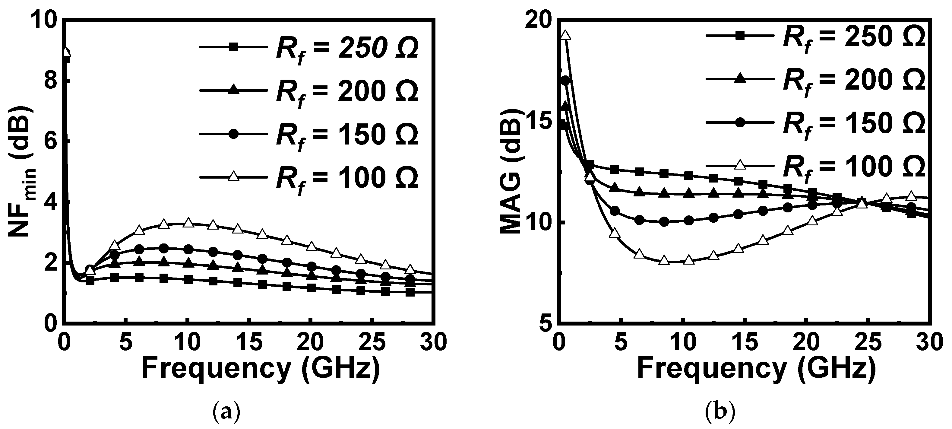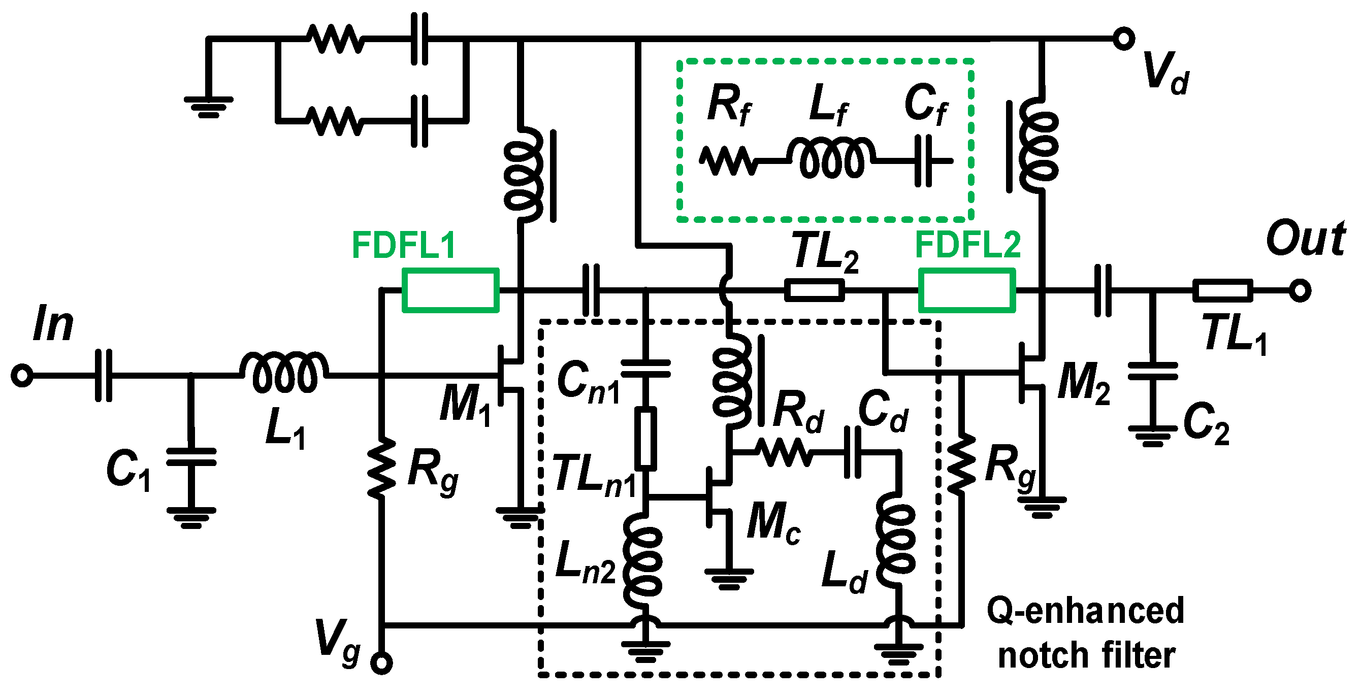 - Chen, W.-L.; Chang, S.-F.; Huang, G.-W.; Jean, Y.-S.; Yeh, T.-H. A Ku-Band Interference-Rejection CMOS Low-Noise Amplifier Using Current-Reused Stacked Common-Gate Topology. IEEE Microw. Wirel. Compon. Lett. 2007, 17, 718–720. [Google Scholar] [CrossRef]